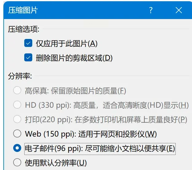 2. 压缩设置:选中任意一张图片,点击顶部菜单栏的【图片格式】-【压缩图片】。在弹出的窗口中,取消勾选“仅应用于此图片”,选择较低分辨率(如“电子邮件”或“Web”),确保批量图片都能按统一标准压缩。
