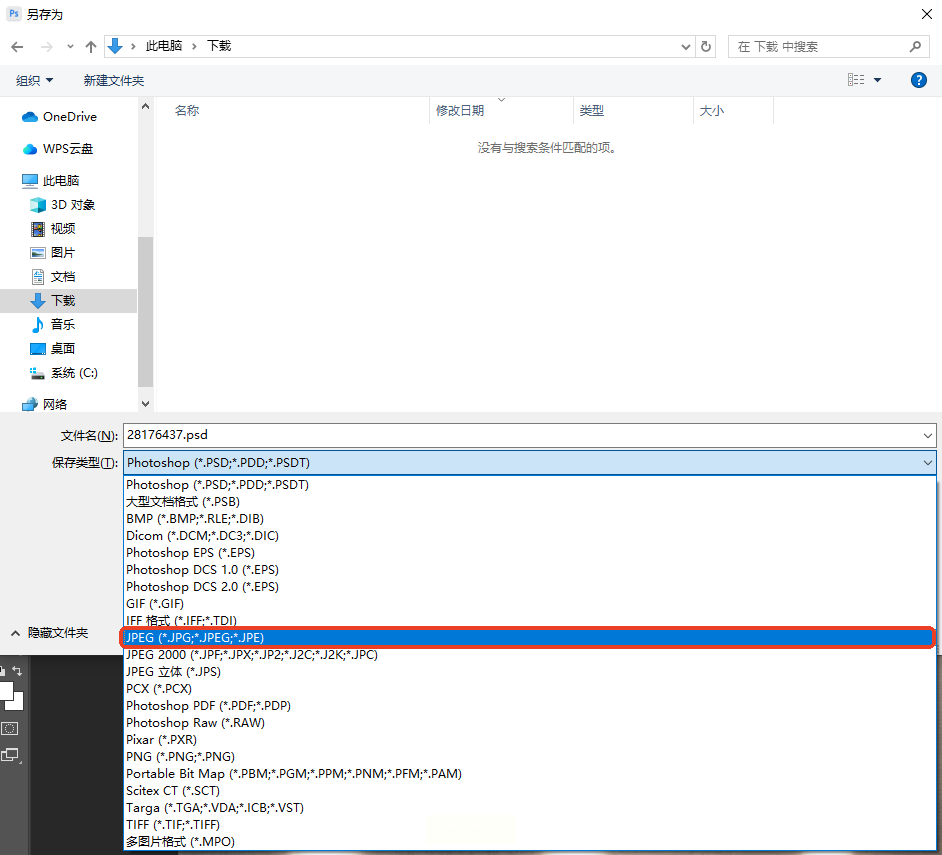 在保存类型下拉菜单中,选择“JPEG”格式。你可以自定义文件名和存储位置,然后点击保存。在接下来的JPEG选项窗口中,还可以调整图像品质,平衡文件大小和画质。