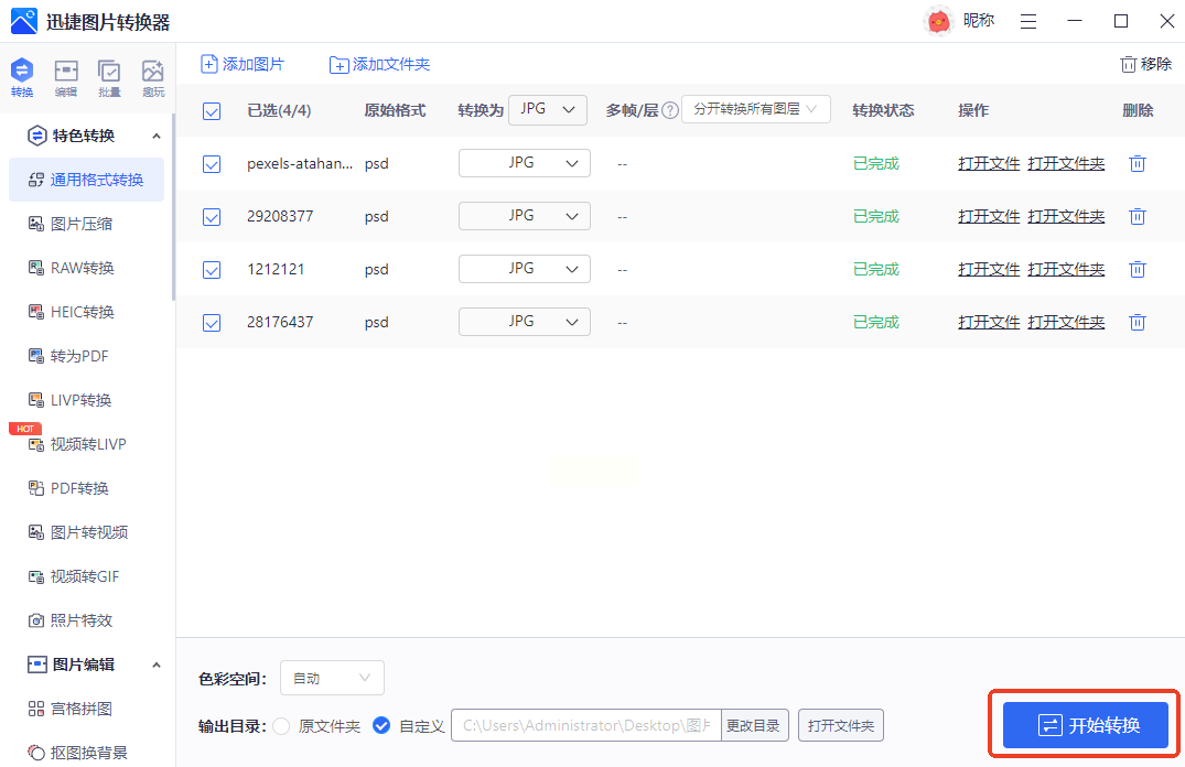 文件加载完成后,在上方格式列表中选择“JPG”作为输出格式。之后,点击界面右下角的“开始转换”即可。部分软件会提供免费转换次数,适合临时使用。