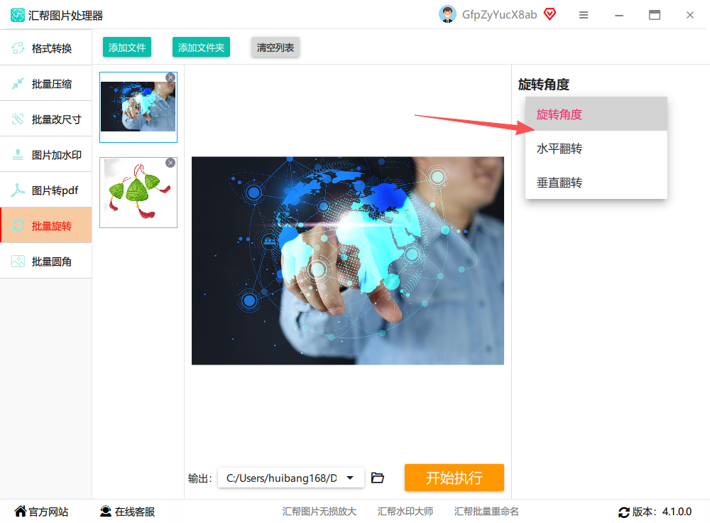 步骤四:设置旋转参数的同时,左侧的图片预览图会实时显示调整后的效果,方便你确认。接着,在下方设置好处理完成后图片的保存文件夹路径。最后,点击界面上的“开始执行”按钮。