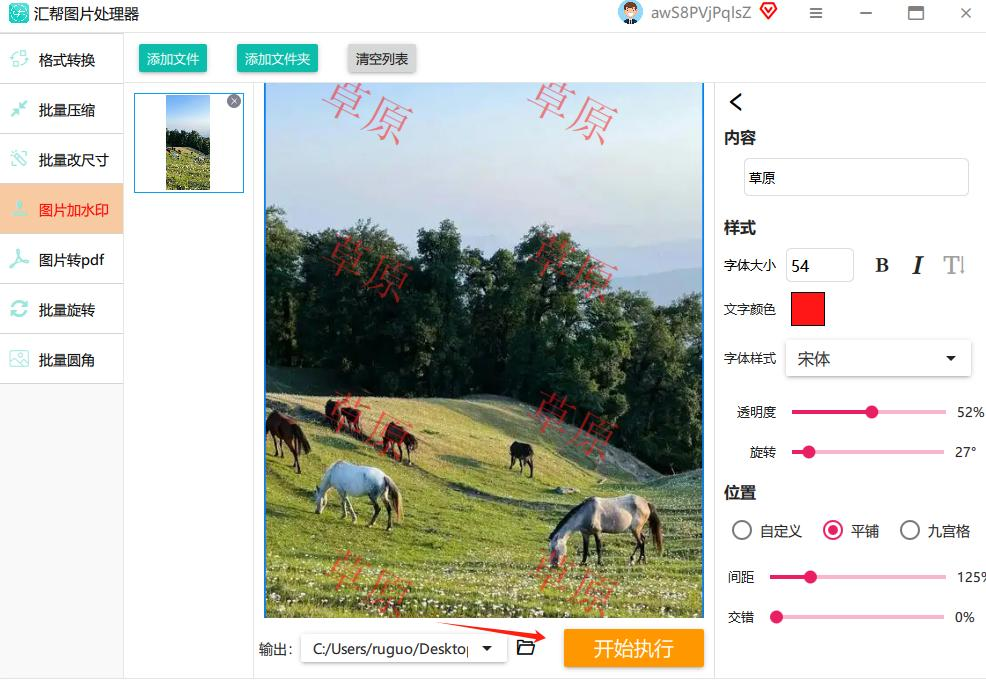 全部设置好后,点「开始执行」,软件会自动给所有图片加水印。如果中途想暂停,点「取消」就行;处理完成后,去输出目录找图片,文件名后面会自动加上“_watermarked”的标记,一眼就能识别。