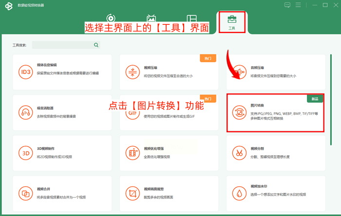 - 步骤1:打开软件,点击主界面“工具”选项卡,选择“图片转换”功能;
