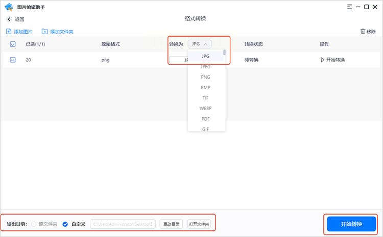 - 步骤3:在“输出格式”中确认JPG,设置“输出目录”(如桌面);