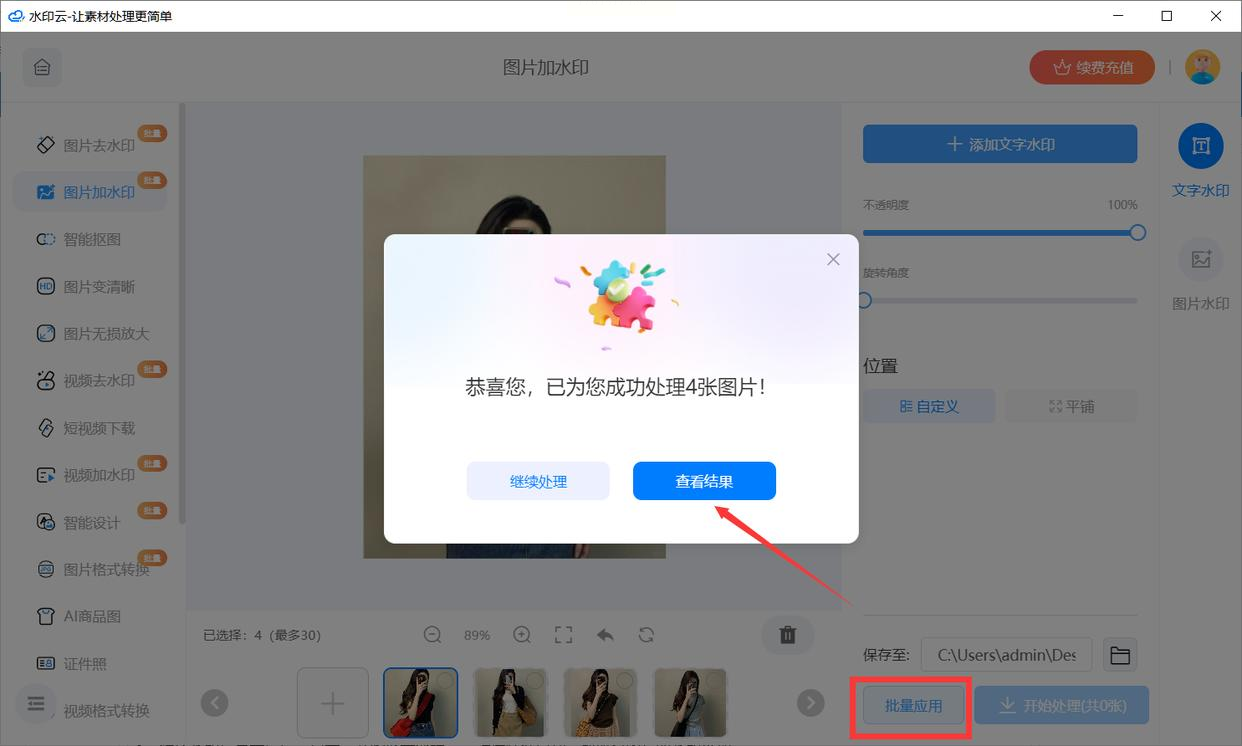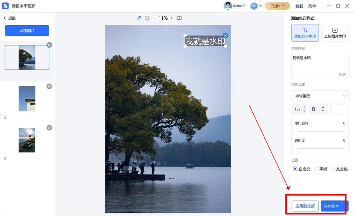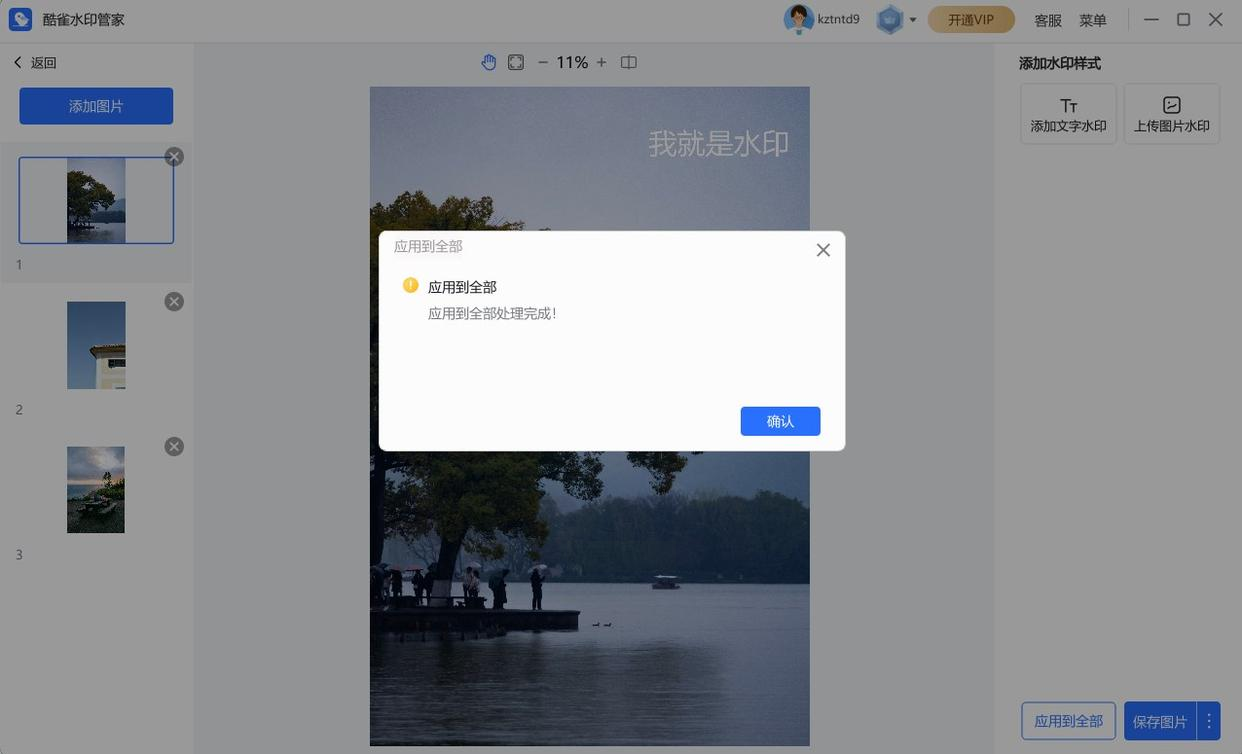 有个很好用的按钮叫 “应用到全部”,记得点击它,这样所有图片的水印就统一了。然后,你可以选择一张张预览保存,或者直接点击 “保存全部图片”。