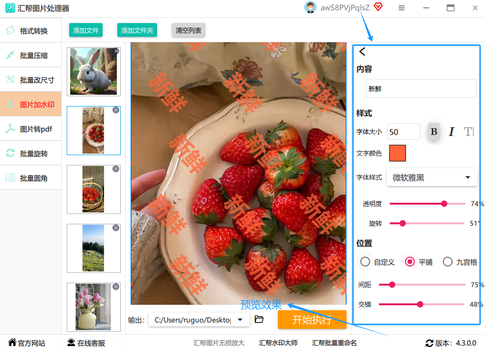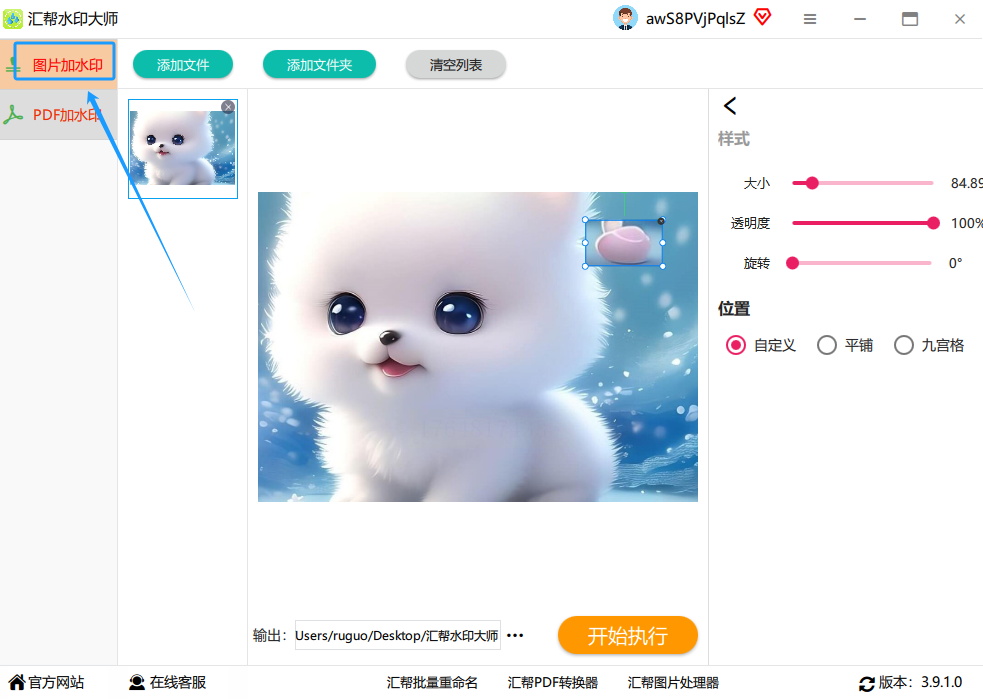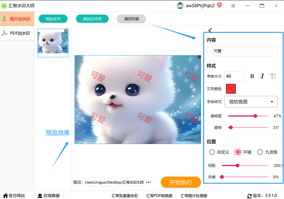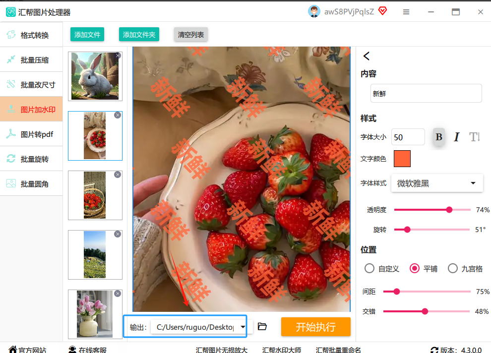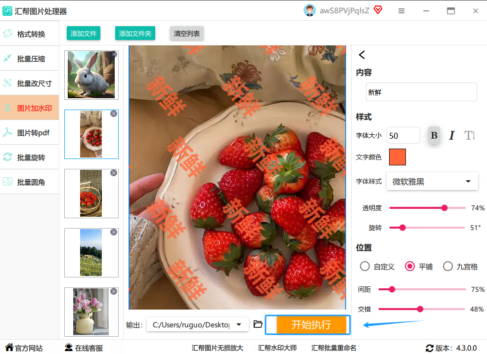 最关键的一步来了!检查一遍所有设置,确认无误后,点击右下角那个醒目的 “开始执行” 按钮。然后,你就喝口水,稍等片刻。软件会自动处理所有图片,完成后,你去刚才选的文件夹里看看,所有图片都已经乖乖地带上水印了。
