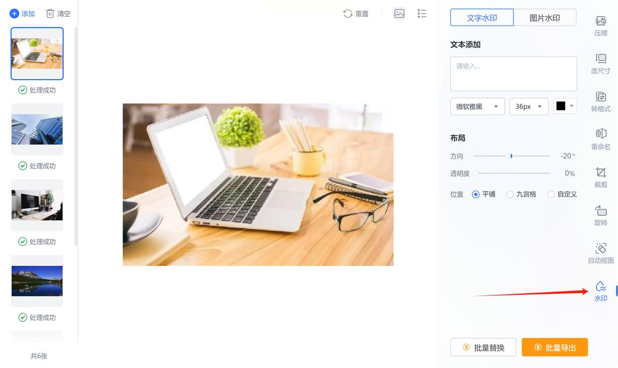核心逻辑都是一样的:导入图片 -> 设置水印(内容、样式、位置)-> 应用到全部 -> 批量输出。