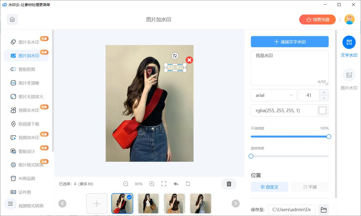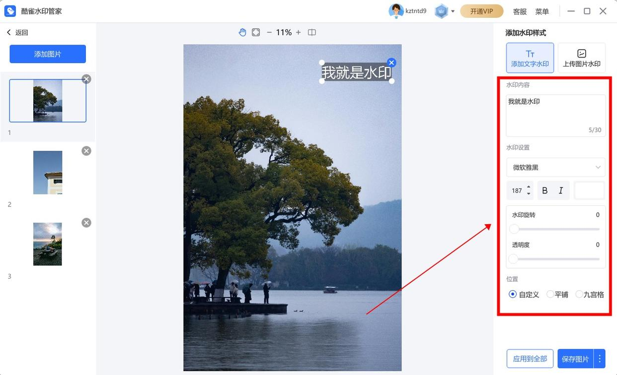 在设置区,选择是加“文字”还是加“图片”水印。然后进行详细设置:内容、位置(可以拖动)、大小、透明度,一个都不能少。这类软件往往在“位置”上有更灵活的选项。