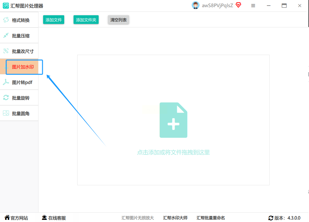 在左边那一栏里,找到并点击 “图片加水印” 这个选项。点进去,就来到主操作区了。