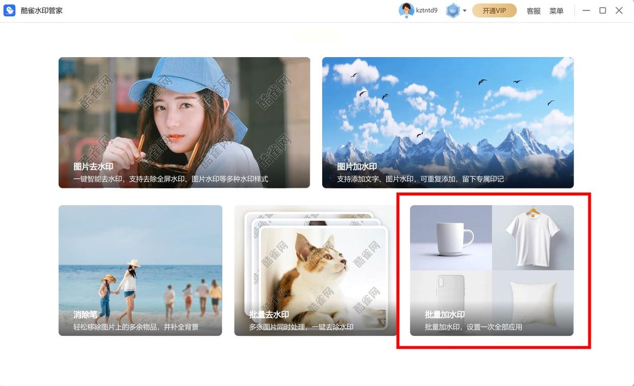 启动后,在软件首页就能看到 “批量加水印” 的功能卡片,点它进去。