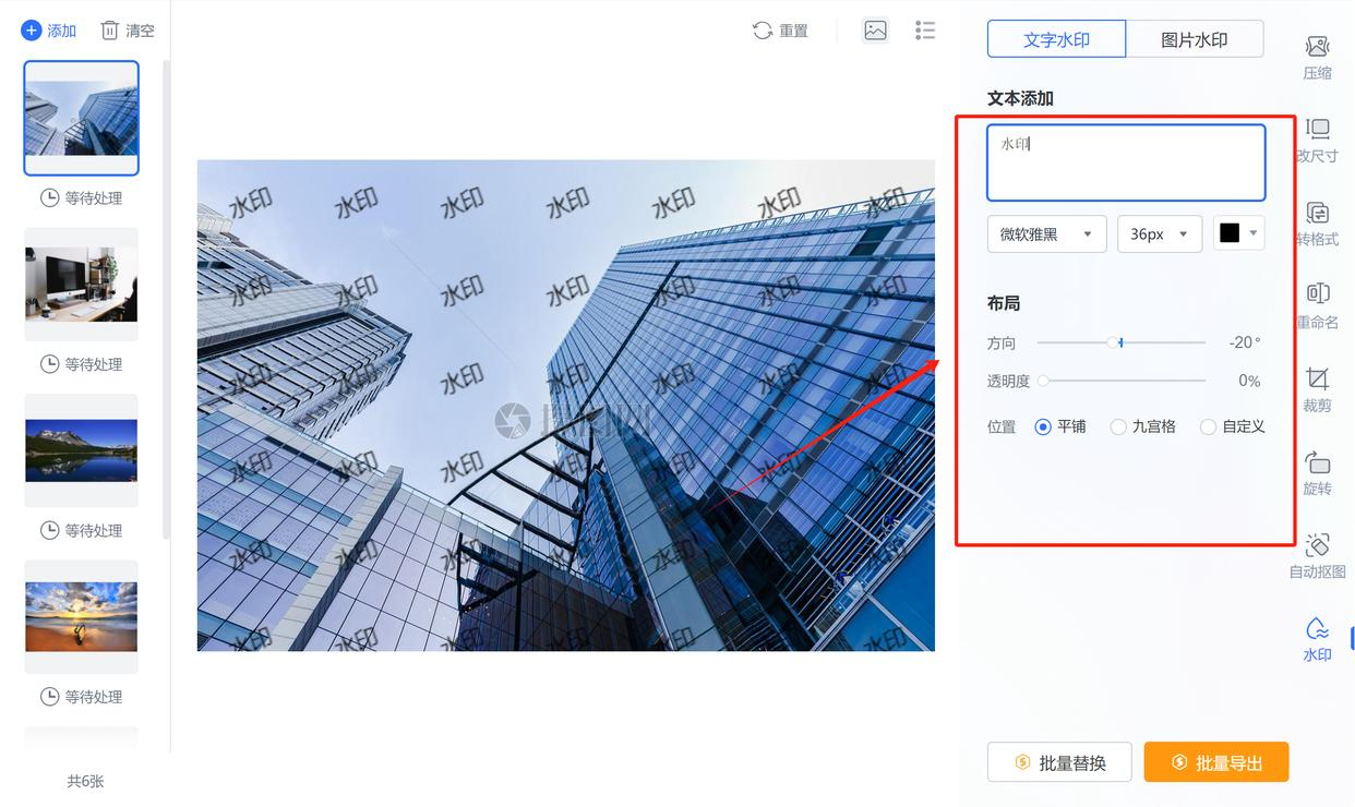 图片导进来之后,看右边。我们需要点击 “添加文字水印” 这个按钮。点了之后,界面就会切换到水印设置页面。