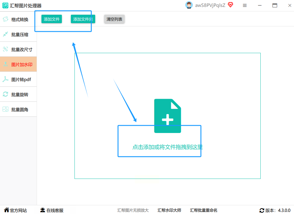看左下角,有个 “添加文件” 的按钮。点它,然后就像平时打开文件一样,在你的电脑文件夹里,把需要加水印的图片全都选中。放心,它不挑格式,JPG、PNG都没问题。而且,一次性加多少张都行,没有数量限制。你也可以偷个懒,直接把图片文件拖拽到这个软件窗口里,更快。