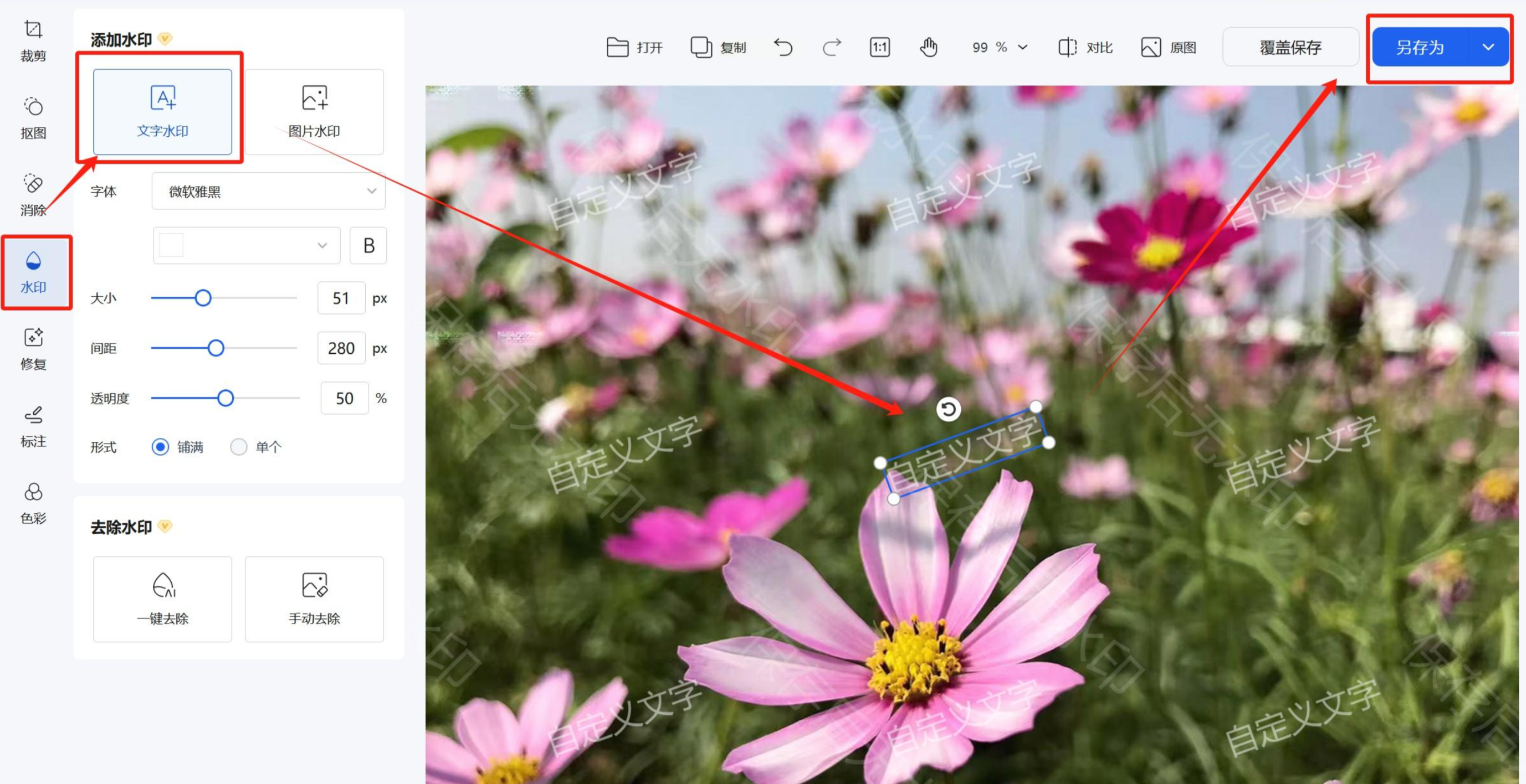 5. 精细调整水印样式:这是关键步骤!在右侧,你可以对水印进行全方位调整: