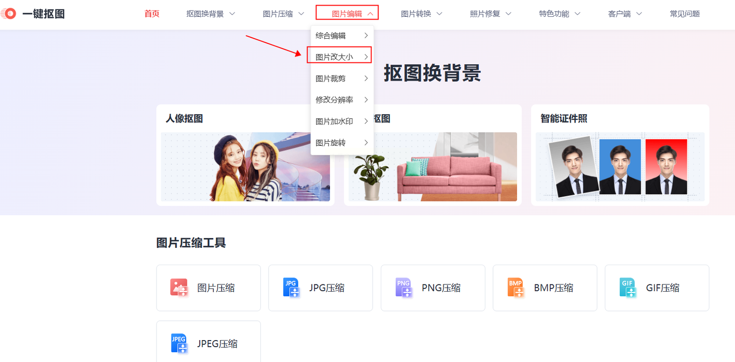 步骤一:访问一键抠图在线平台。在网站首页找到“图片编辑”功能模块,选择其中的尺寸修改工具。