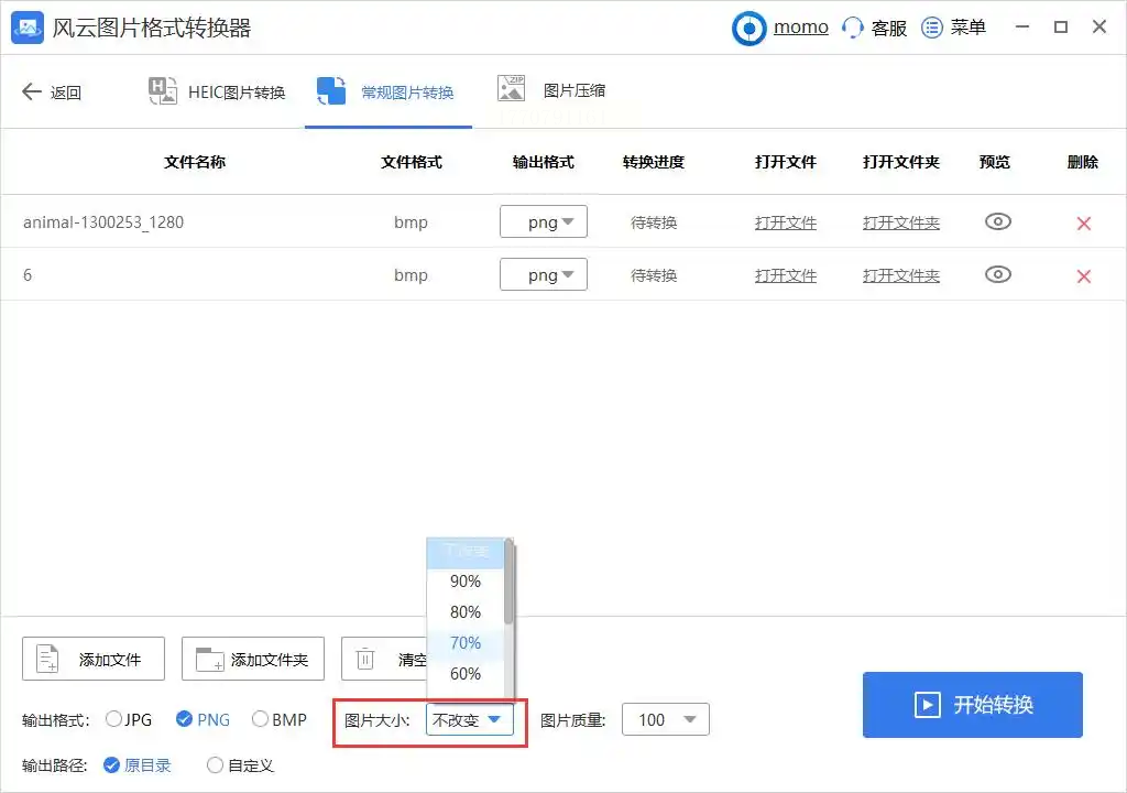 2. 设置参数:在右侧参数面板中选择输出格式为「PNG」,若需调整尺寸或压缩率,可勾选「自定义尺寸」或「保持原比例」选项(如需保留原图质量,建议不调整尺寸)。