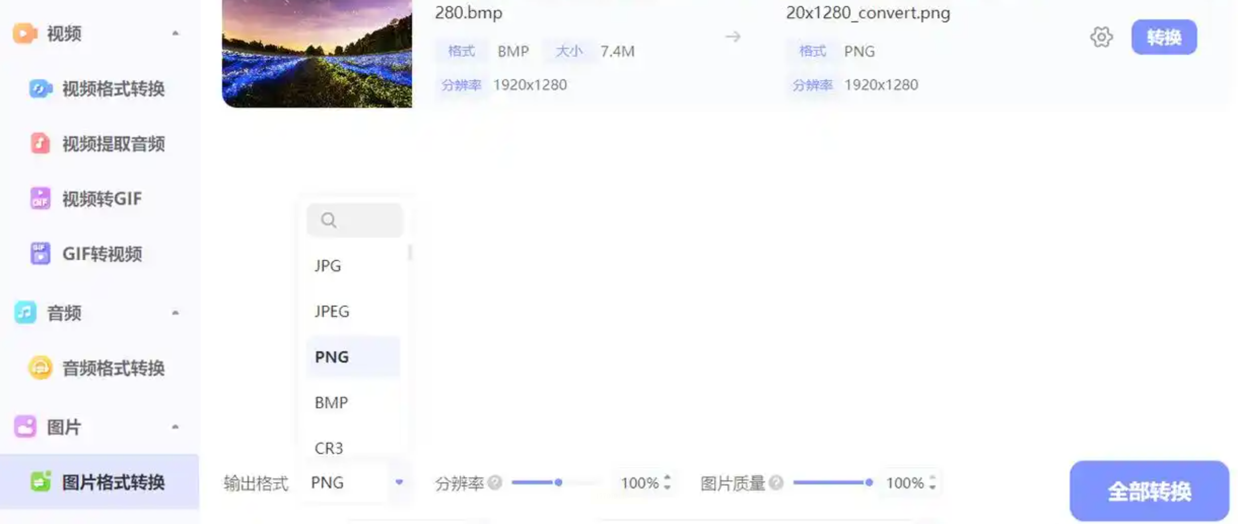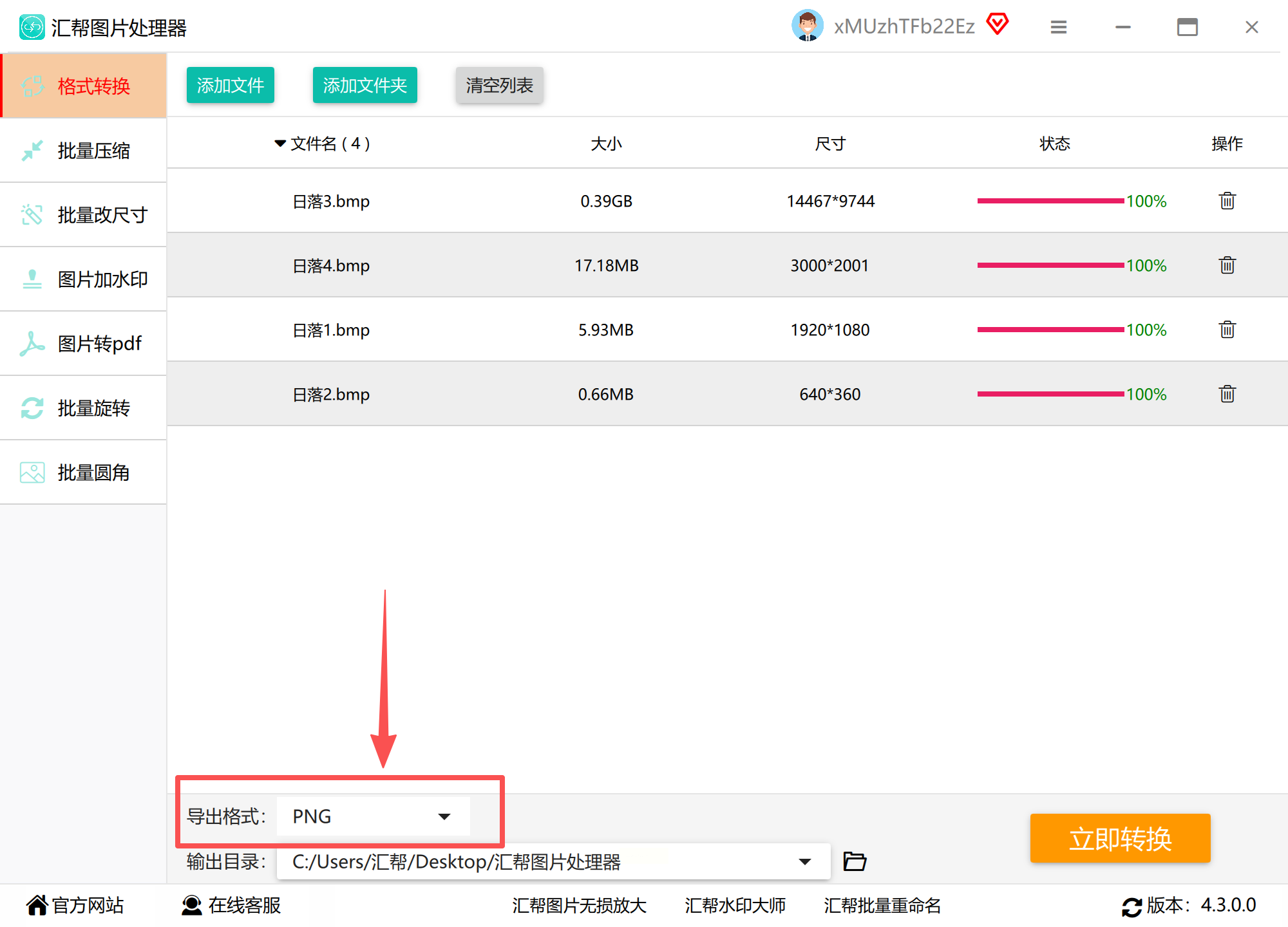 2. 选择输出格式:在格式列表中选择「PNG」,软件支持100+种格式导出(含冷门格式如WebP、SVG),按需勾选。