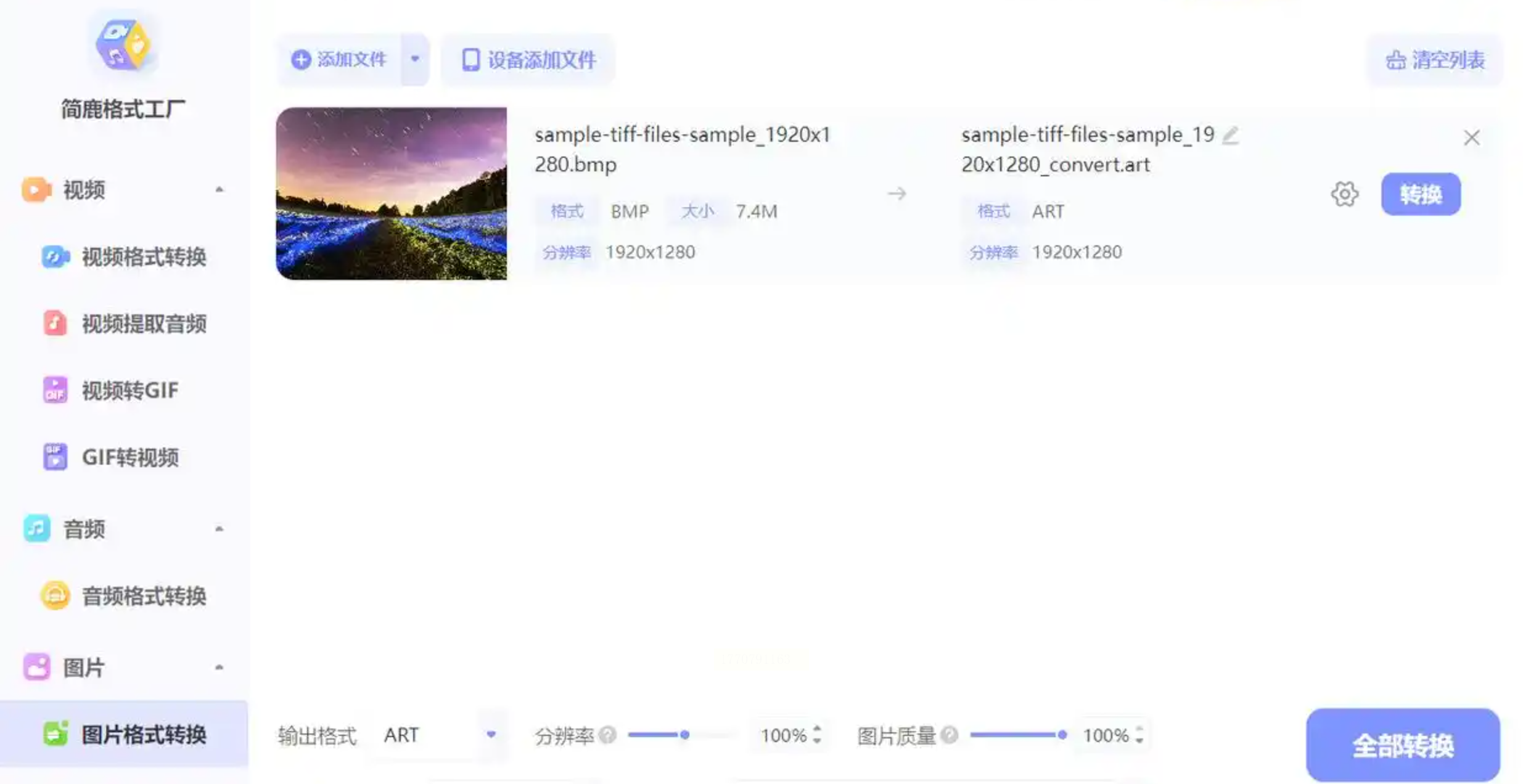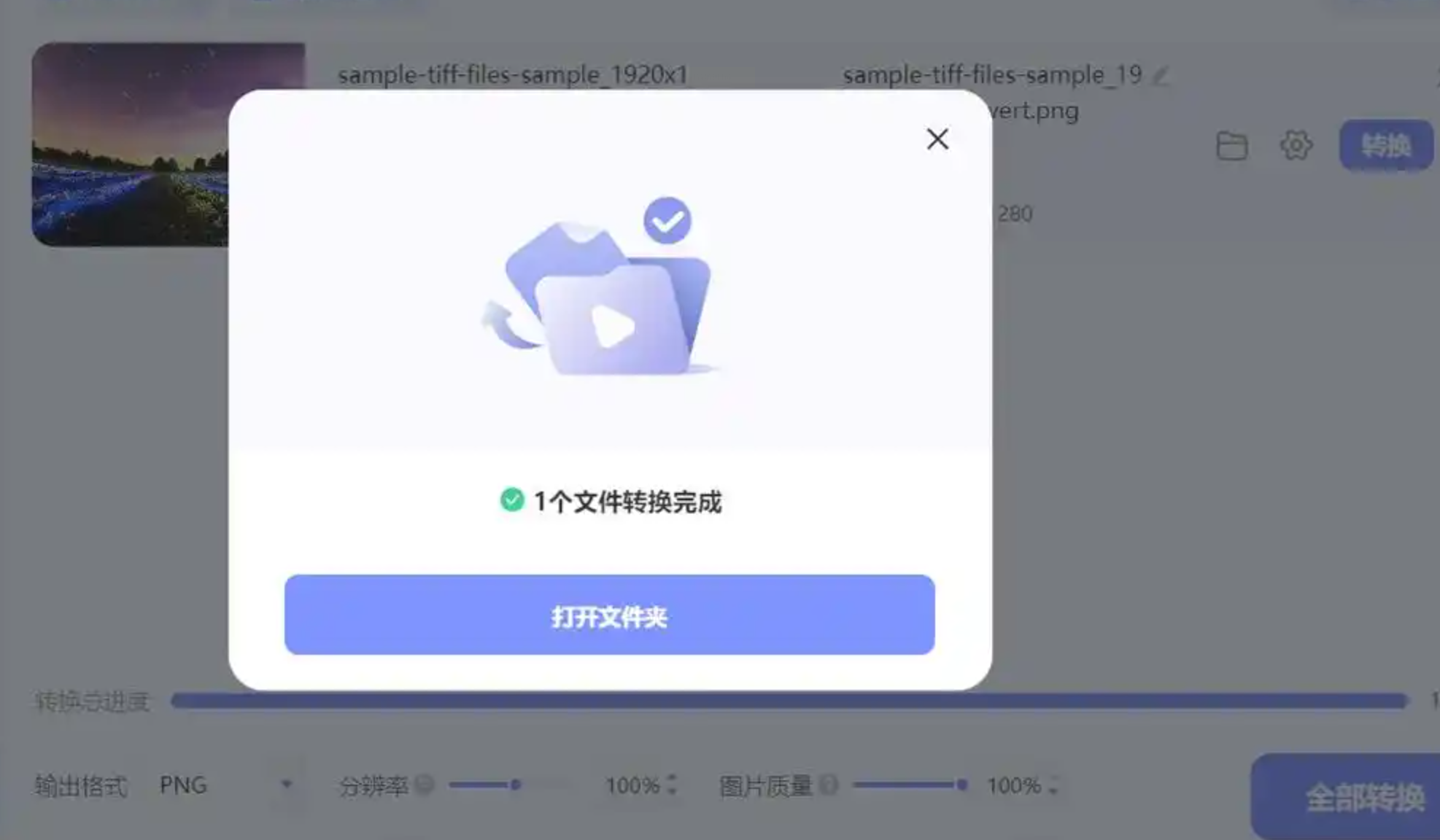 5. 批量转换:点击「全部转换」,软件会依次处理所有添加的图片,底部进度条显示总体完成度。转换结束后,点击「打开输出文件夹」直接查看结果。