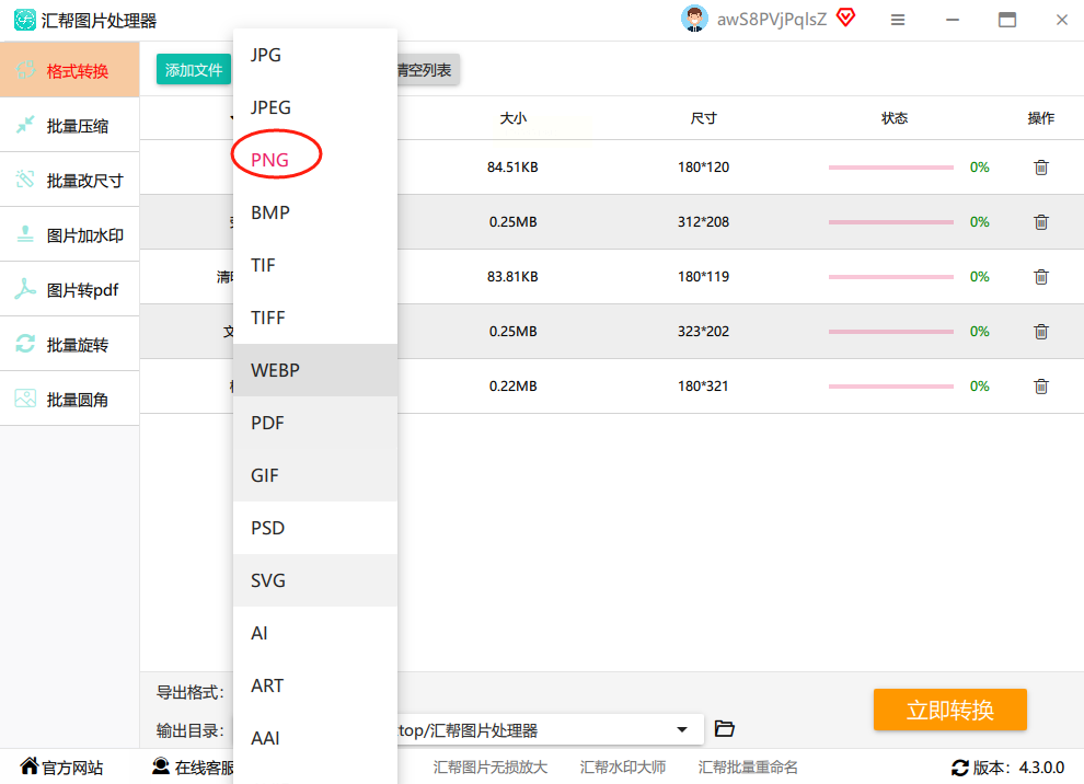 图片导好后,看界面上方。有个下拉菜单写着“输出格式”,点开它,从列表里找到“PNG”,选中。这时候你可以留意一下,软件通常会显示转换后的预估文件大小,比BMP小很多,挺直观的。