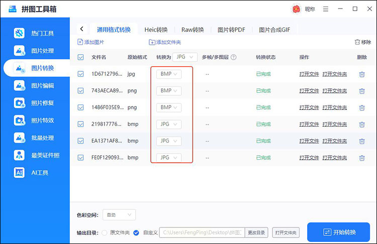 3. 在"输出格式"中选择"BMP",勾选"自动重命名"可避免文件名冲突、
