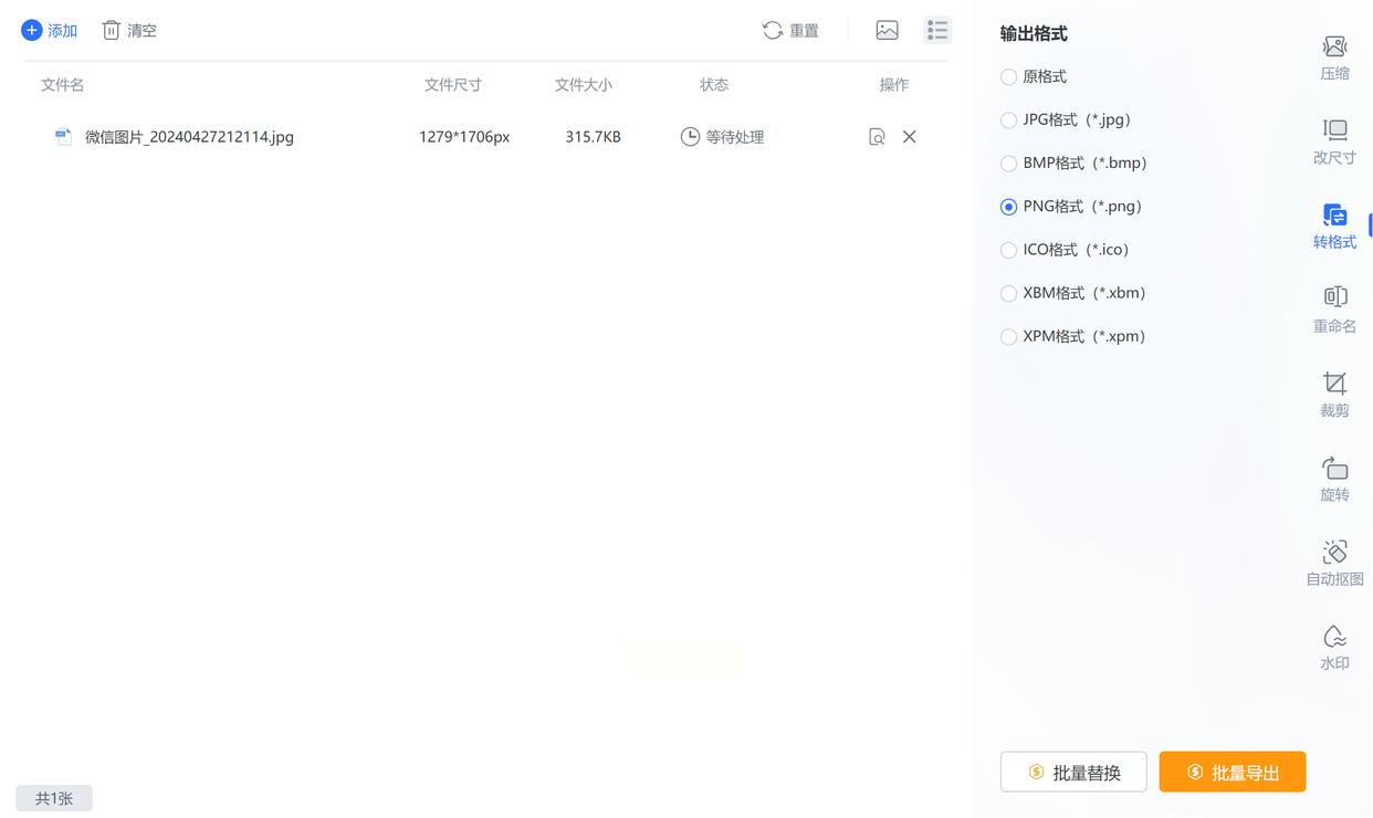3. 选择输出格式:在"输出格式"下拉菜单中选择"PNG",确保目标格式正确。如果需要转换透明背景,可以在设置中选择"透明背景"选项(如果图片本身没有透明区域,此选项可能无效)。