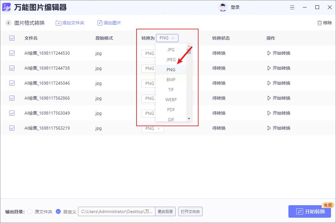 步骤二:接着在界面上方的“转换格式”选项里,选择PNG格式。确认一下输出的位置没问题后,点击右下角的“开始转换”,软件就会自动处理所有图片,等一会儿就能看到转换好的PNG文件了。