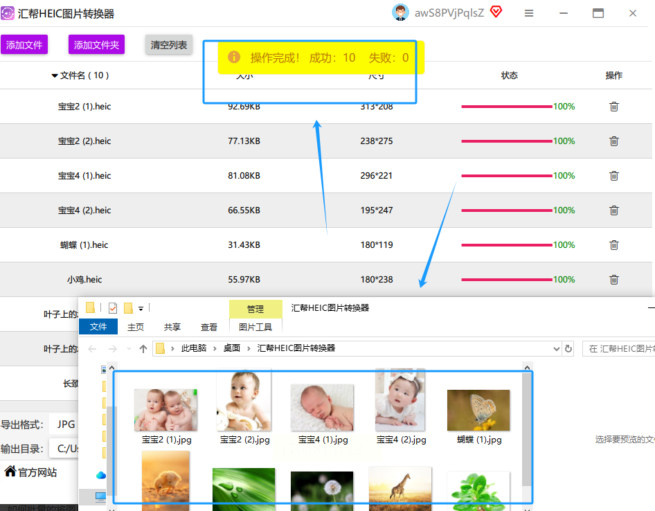 稍等片刻,提示转换成功。你就可以去目标文件夹验收成果了,清一色的JPG,看着就舒心。