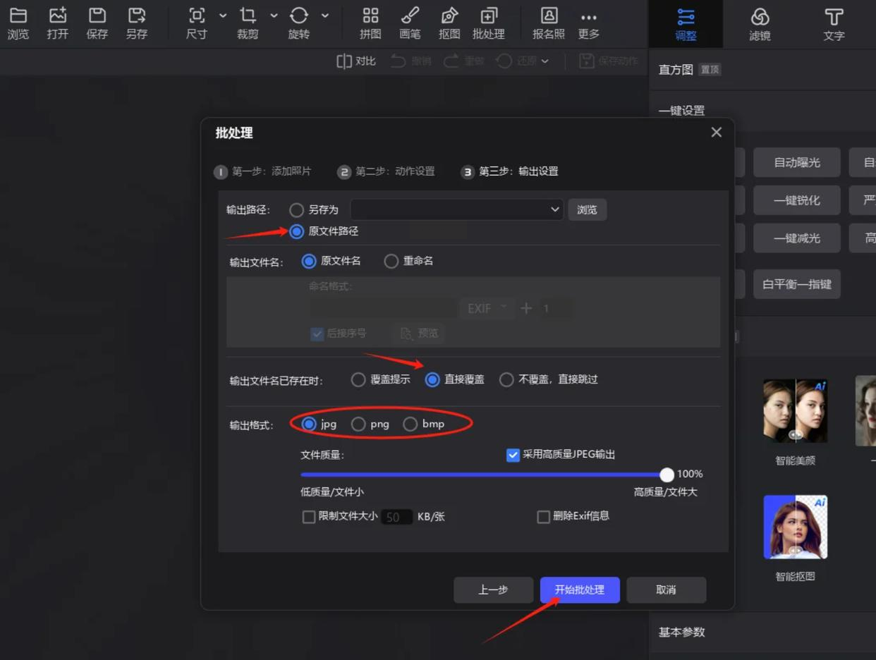 照片添加成功后,界面下方或侧边,格式选择那里,JPG格式往往已经被默认勾选了,非常贴心。你只需要确认一下就好。