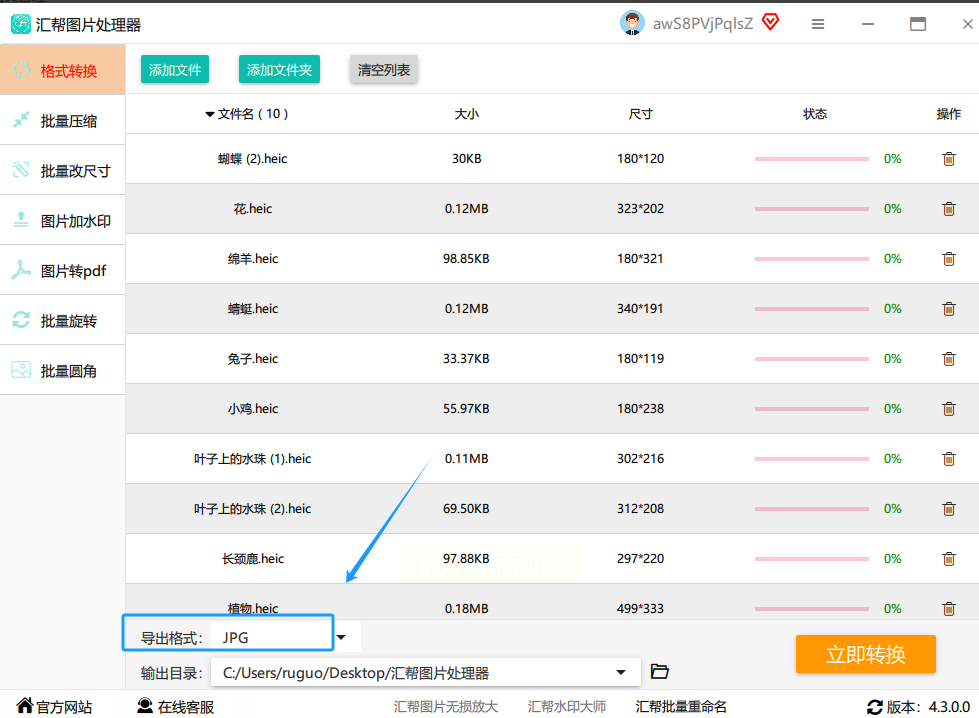 首先,用浏览器打开它的网站。在它的工具列表或菜单里,找到 “图片格式转换” 或类似名称的功能。点击进入转换页面。你会看到一个上传按钮,点击它,从电脑里选择你要转换的HEIC照片,可以多选。传上去之后,在输出格式那里,选择 JPG。最后,点击“智能转换”或“开始转换”这样的按钮。