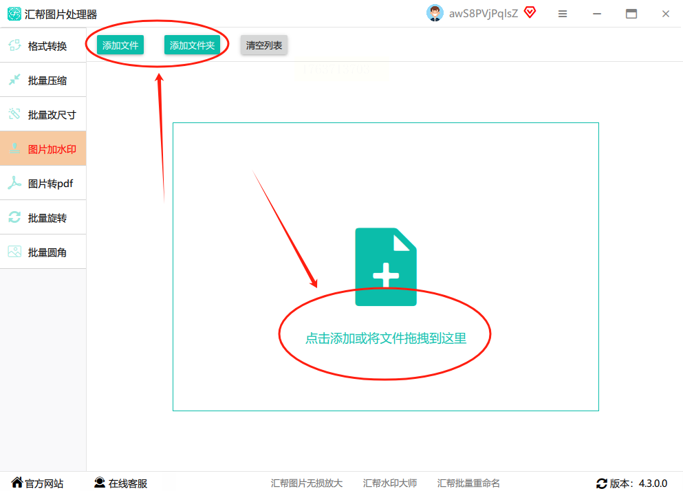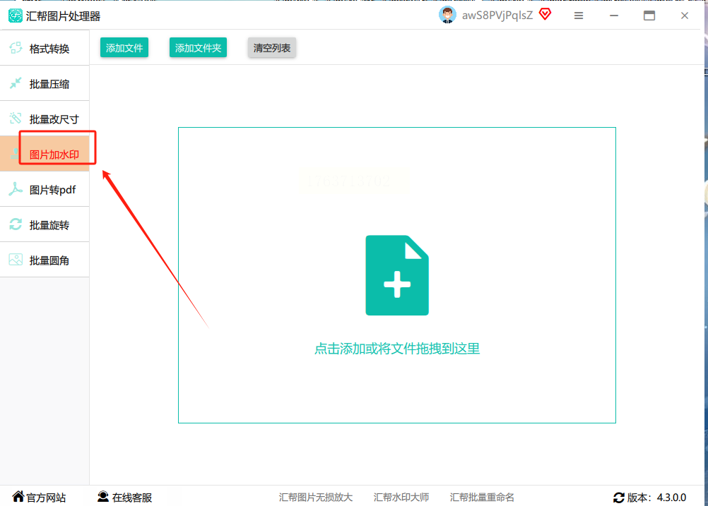 第一步:启动软件后,你会看到清晰的功能分区。在左侧菜单栏中找到“图片加水印”模块,用鼠标单击进入。这个模块专门为添加水印设计,所有相关功能都集中在这里。