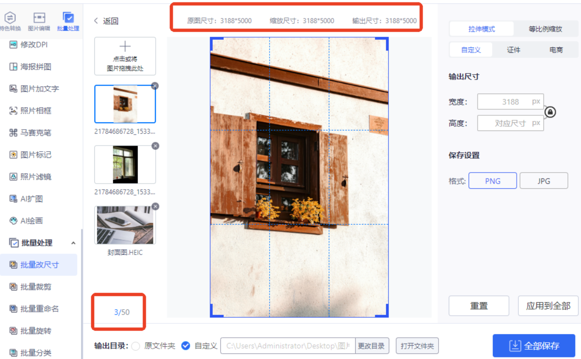 - 界面实时显示原图尺寸、输出尺寸、格式等信息