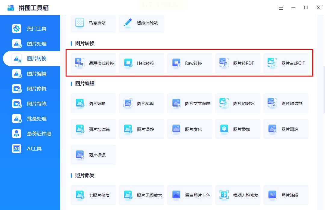 打开拼图工具箱,在主界面找"通用格式转换"或者"Heic转换"的按钮(有时候在"图片处理"分类里),点进去。