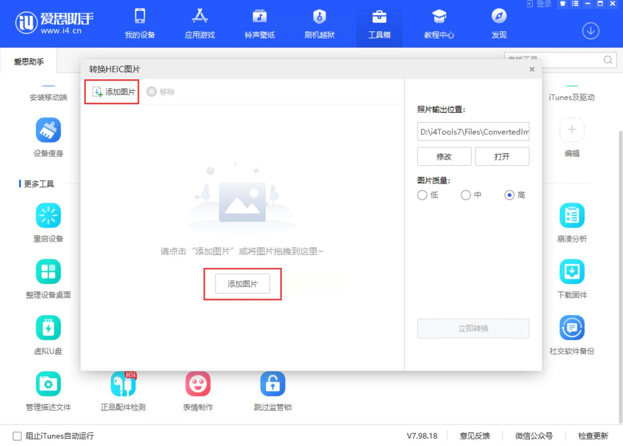 先拿数据线把iPhone或者iPad连到电脑,打开爱思助手。软件打开后,顶部菜单栏会有个"工具箱",点进去,里面有个"转换HEIC图片"的选项,直接点它就行。