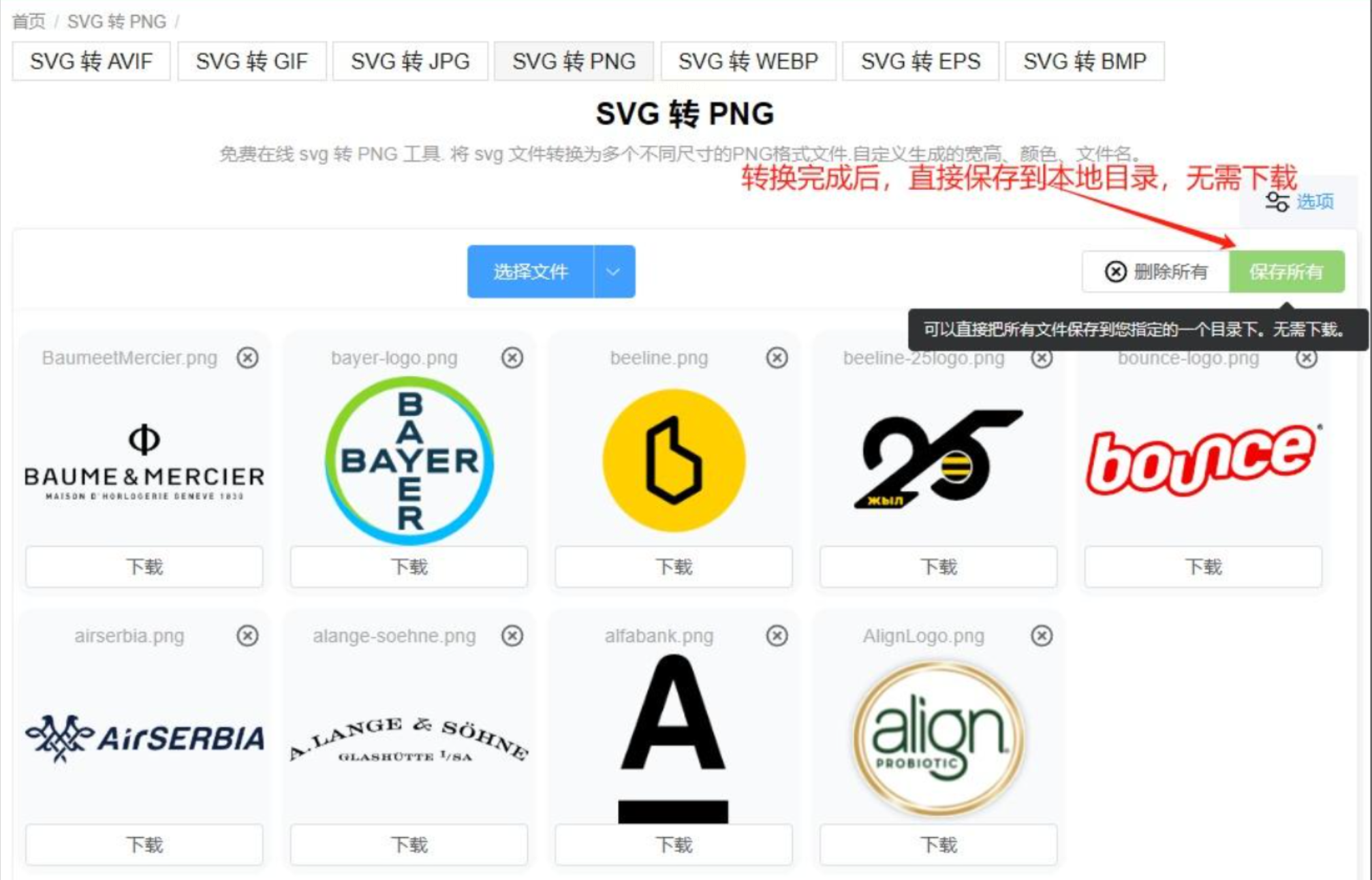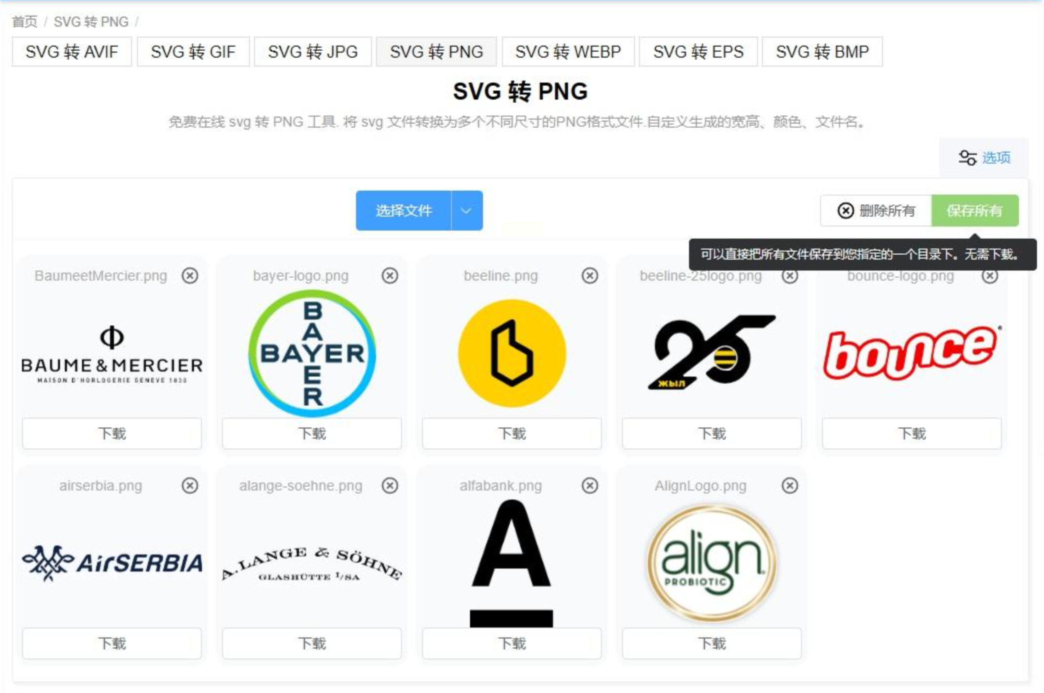 步骤三:设置完成后,点击“转换”按钮。在线工具的处理速度通常很快。转换完成后,页面会提供“下载”或“保存所有”的链接,点击即可将PNG文件保存到本地指定文件夹。