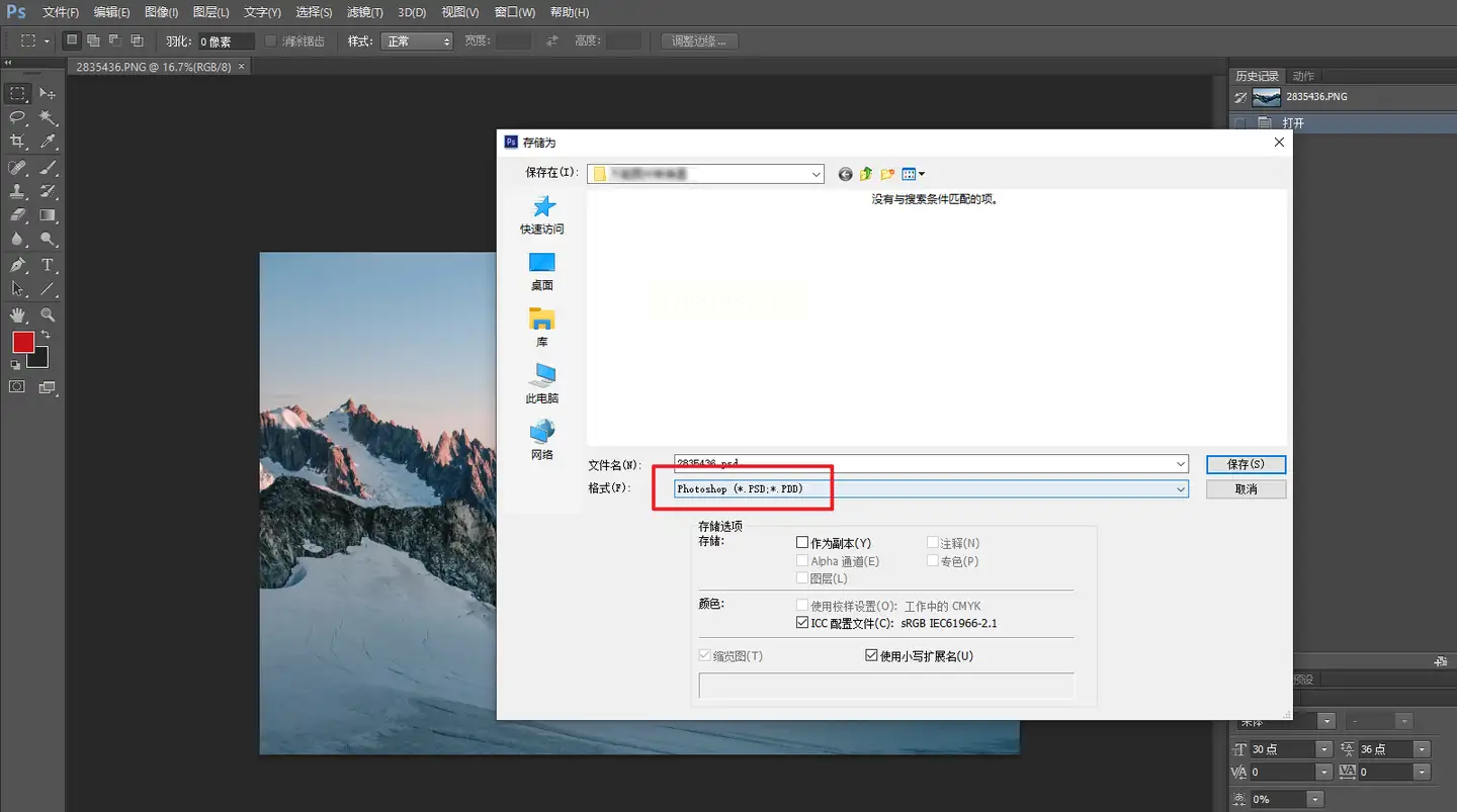 2. 另存为PSD:点击左上角「文件→存储为」,在弹出窗口的“格式”下拉菜单中选择“Photoshop (*.PSD; *.PDD; *.PSDT)”,注意: