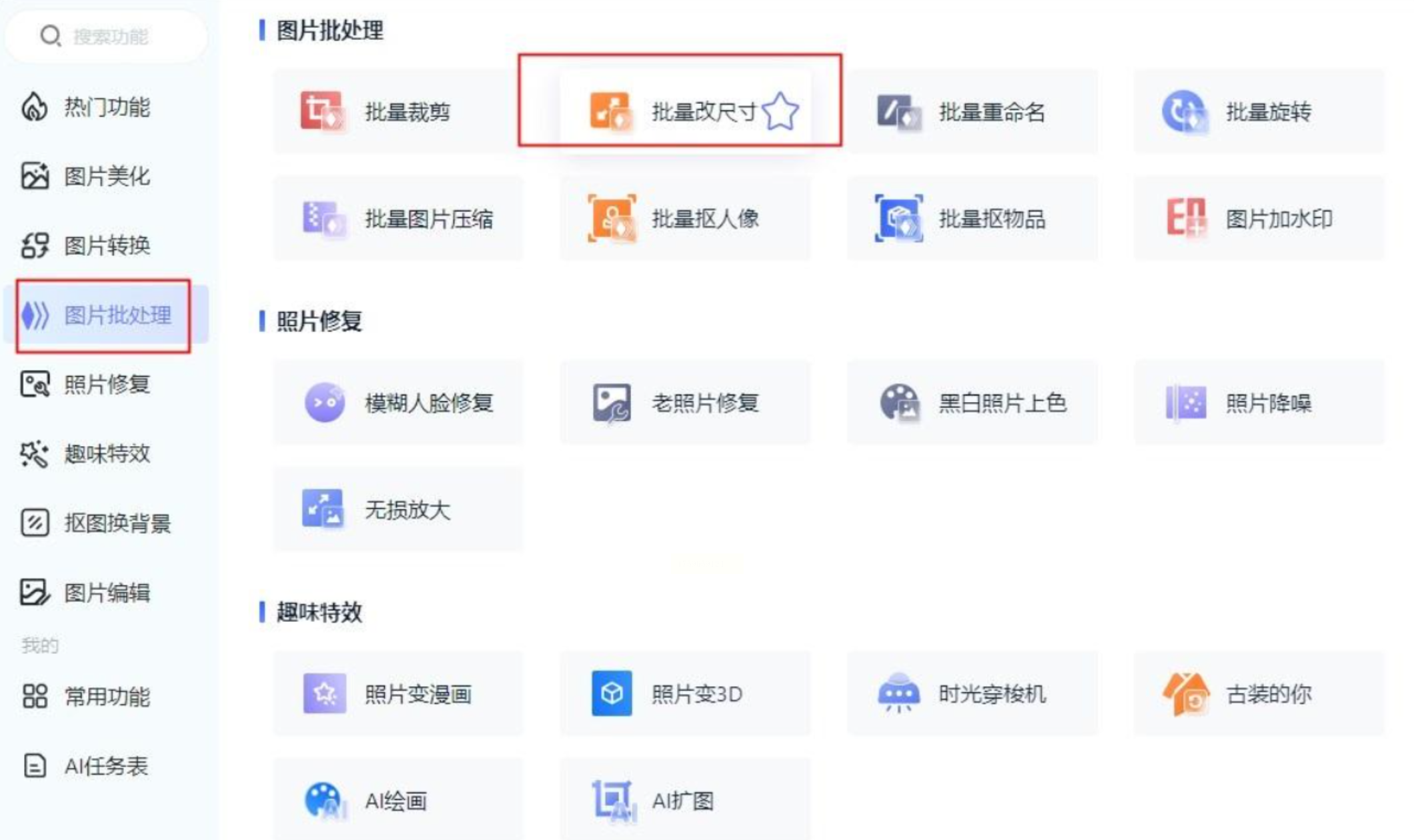 运行软件后,在左侧功能导航区找到“批量修改尺寸”选项,点击“添加文件”按钮,从本地文件夹选择需要调整尺寸的图片。该软件支持JPEG、PNG、BMP等十余种常见格式,可同时导入上百张图片进行批量操作。