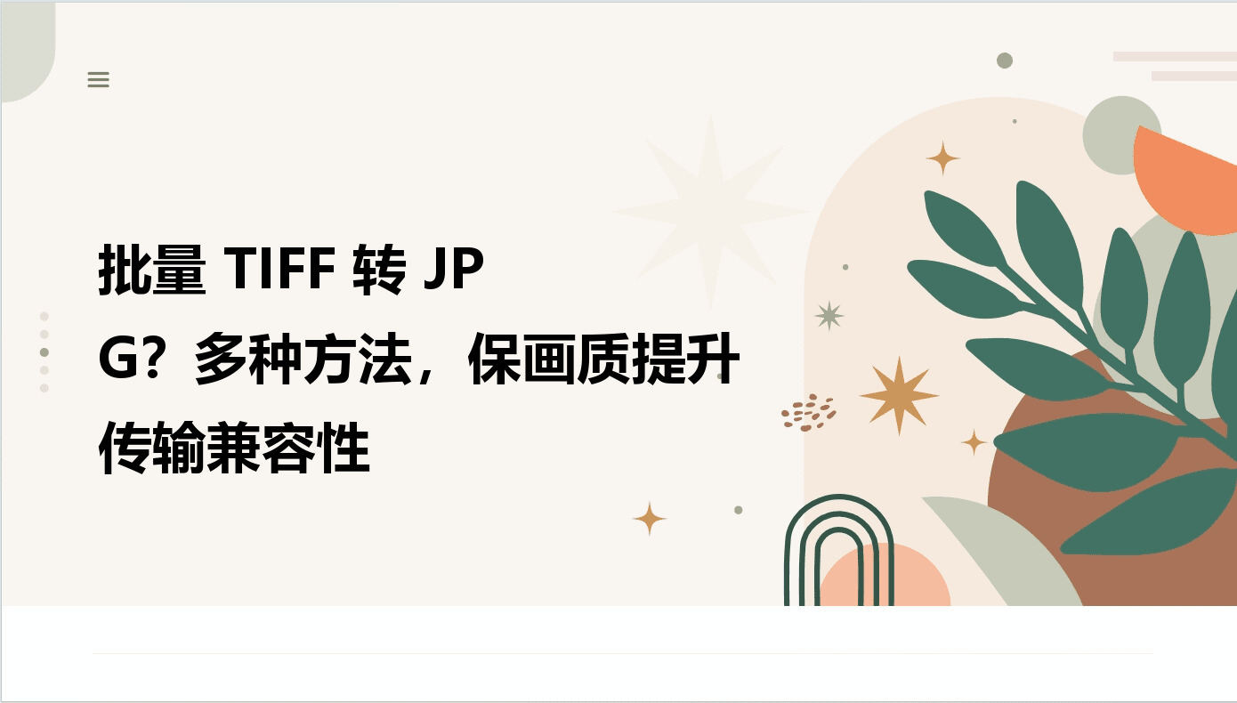 在数字图像处理中,TIFF和JPG是两种常见格式。TIFF格式以无损存储和高细节著称,适合专业设计与存档;但它的文件体积较大,在网页分享、社交媒体传播等场景中不够便捷。而JPG凭借高压缩率和广泛兼容性,成为快速传输与展示的优选格式。当你需要在不同设备间分享图片或优化存储空间时,TIFF转JPG的需求就会自然产生。本文将为你介绍五种简单实用的转换方法,让格式转换变得轻松高效。