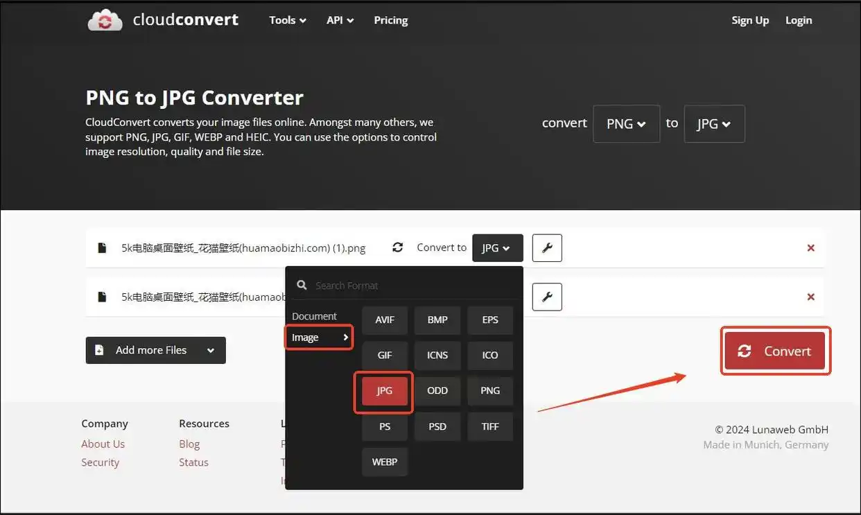 2. 在格式选项中选择“JPG”,支持一次上传两个文件。