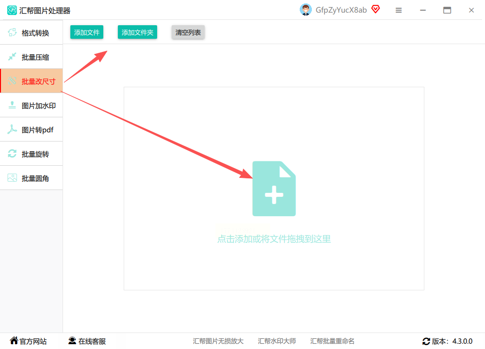 步骤1:打开汇帮图片处理器,选择「批量改尺寸」功能,支持一次性上传多张图片,格式和大小限制较少,操作更灵活。