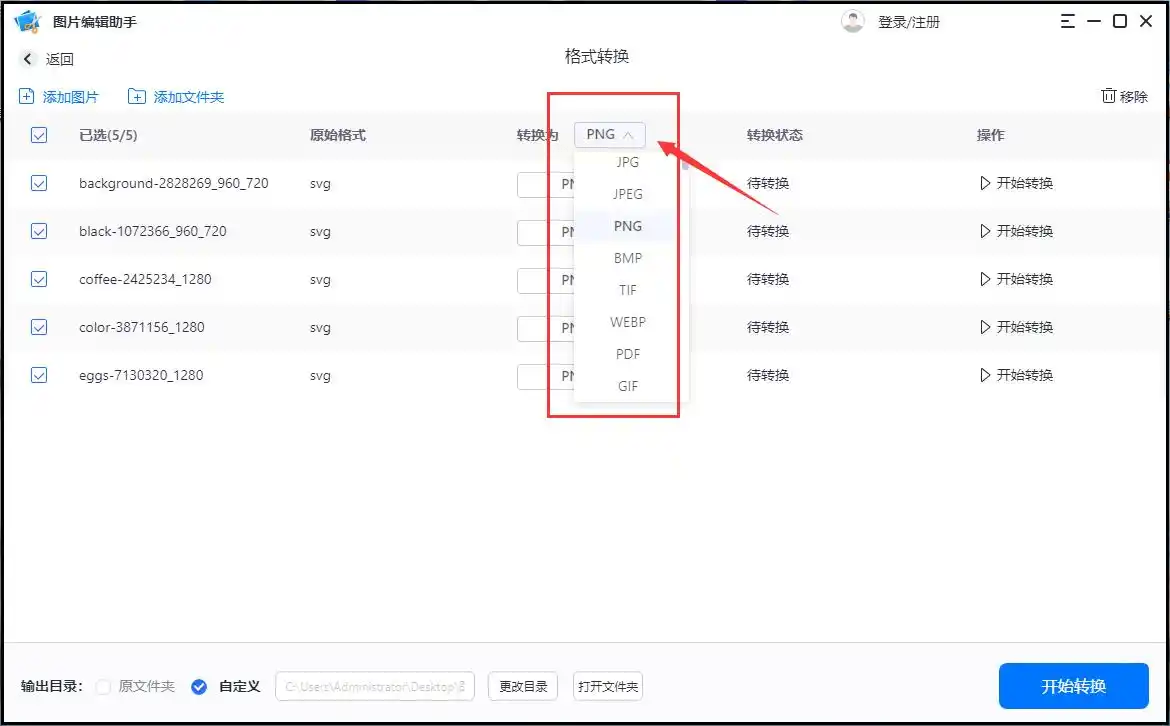 步骤二:在输出设置中,将格式选为PNG,软件也支持JPG、BMP等格式互转。