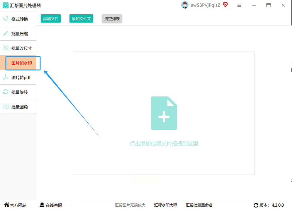 在电脑上找到并打开“汇帮图片处理器”。进去之后别眼花,看界面左侧,找到一个叫 “图片加水印” 的按钮,点它。这就进了核心车间了。