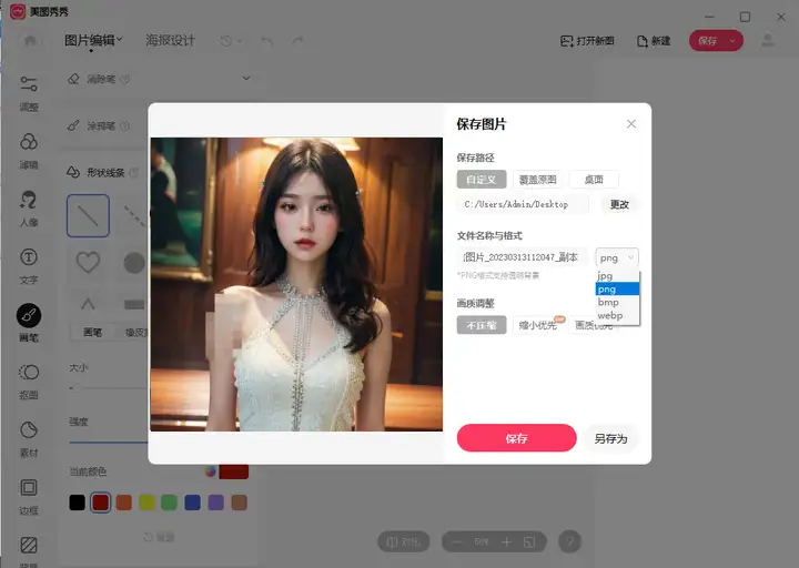 2. 打开后点右上角“保存”,然后在弹出的窗口里选“格式”为JPG,还能改画质(默认就行),最后点保存,就得到新的JPG文件啦。