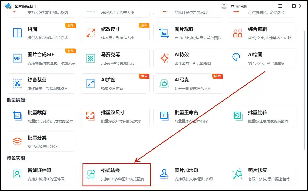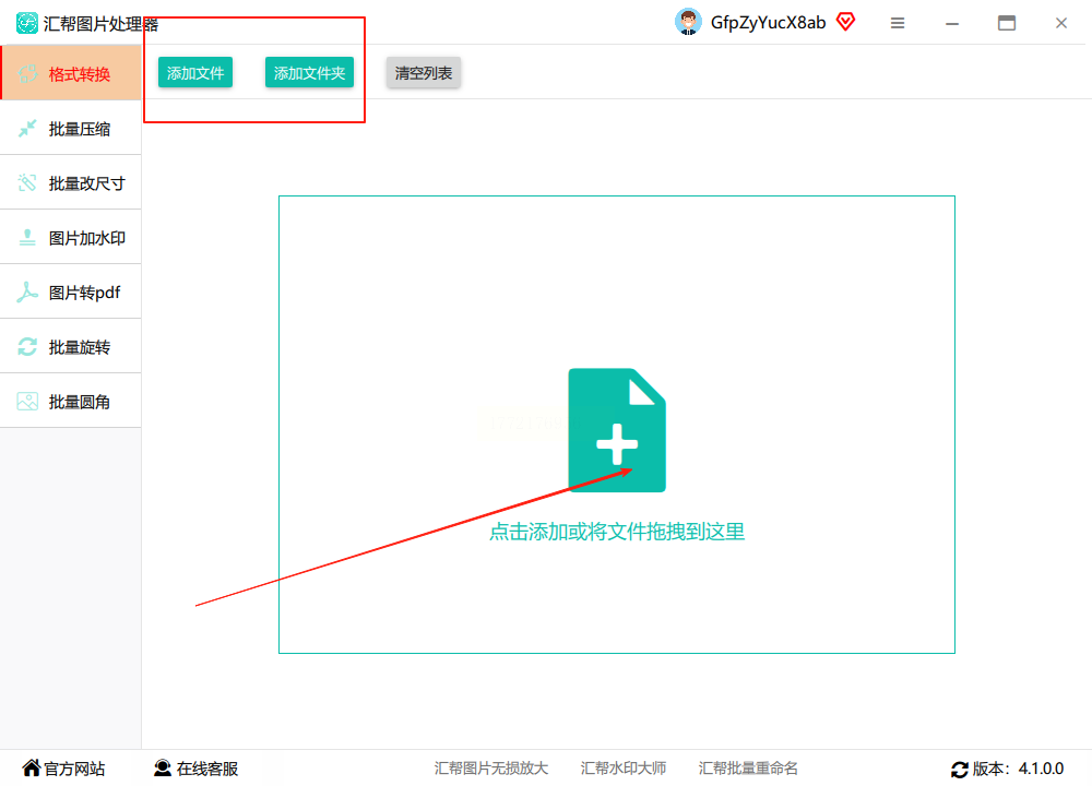 1. 先打开软件,左边菜单点“格式转换”,右边可以点“添加文件”或者直接把图片拖进去(文件多也能一起转,支持批量)。