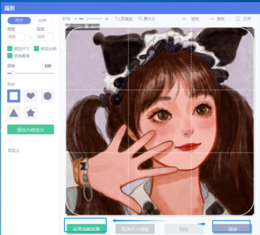 3. 若需更精确的圆角,可使用“裁剪”工具,手动拖动边角调整弧度。