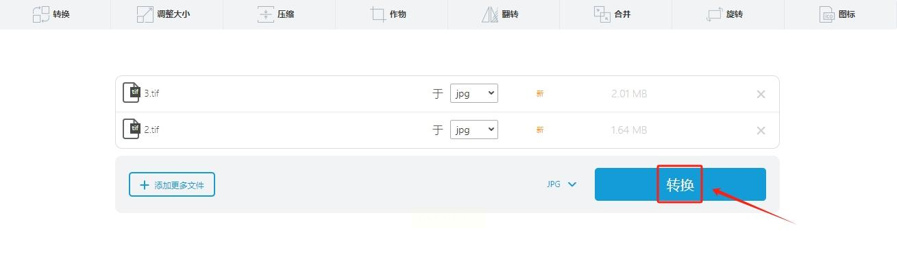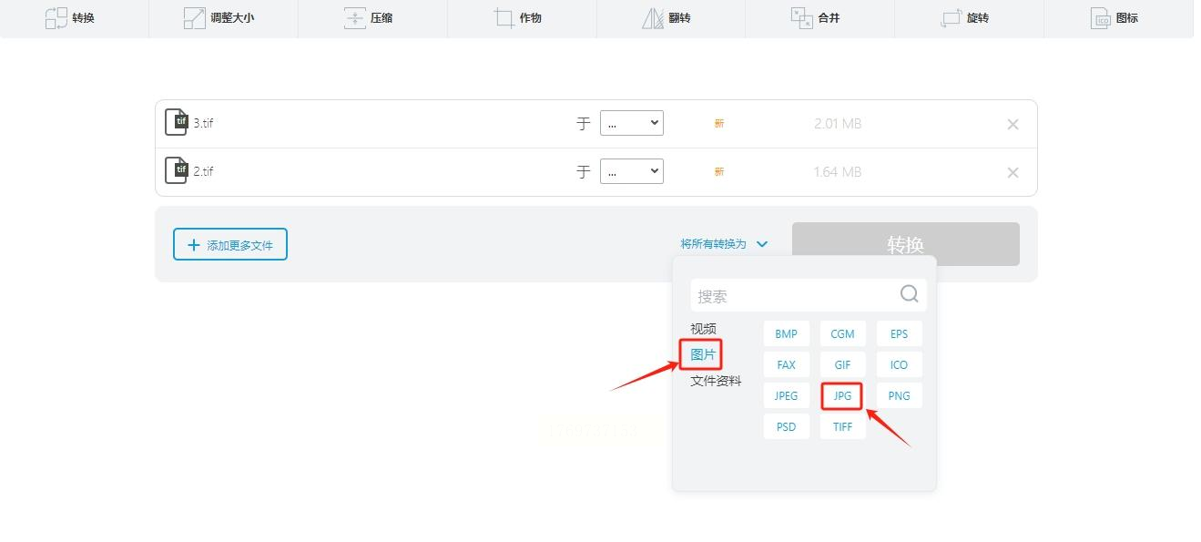 步骤二:所有文件上传成功后,在“转换为”的格式选项列表中,找到并选择“JPG”。