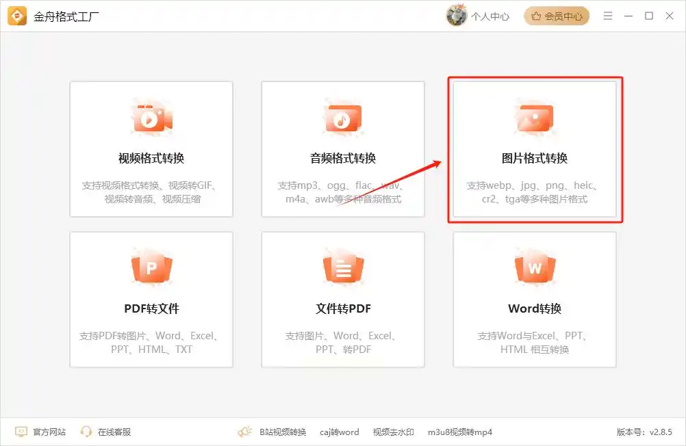 步骤一:在电脑上安装并启动“金舟格式工厂”。在主界面找到“图片格式转换”功能并点击进入。