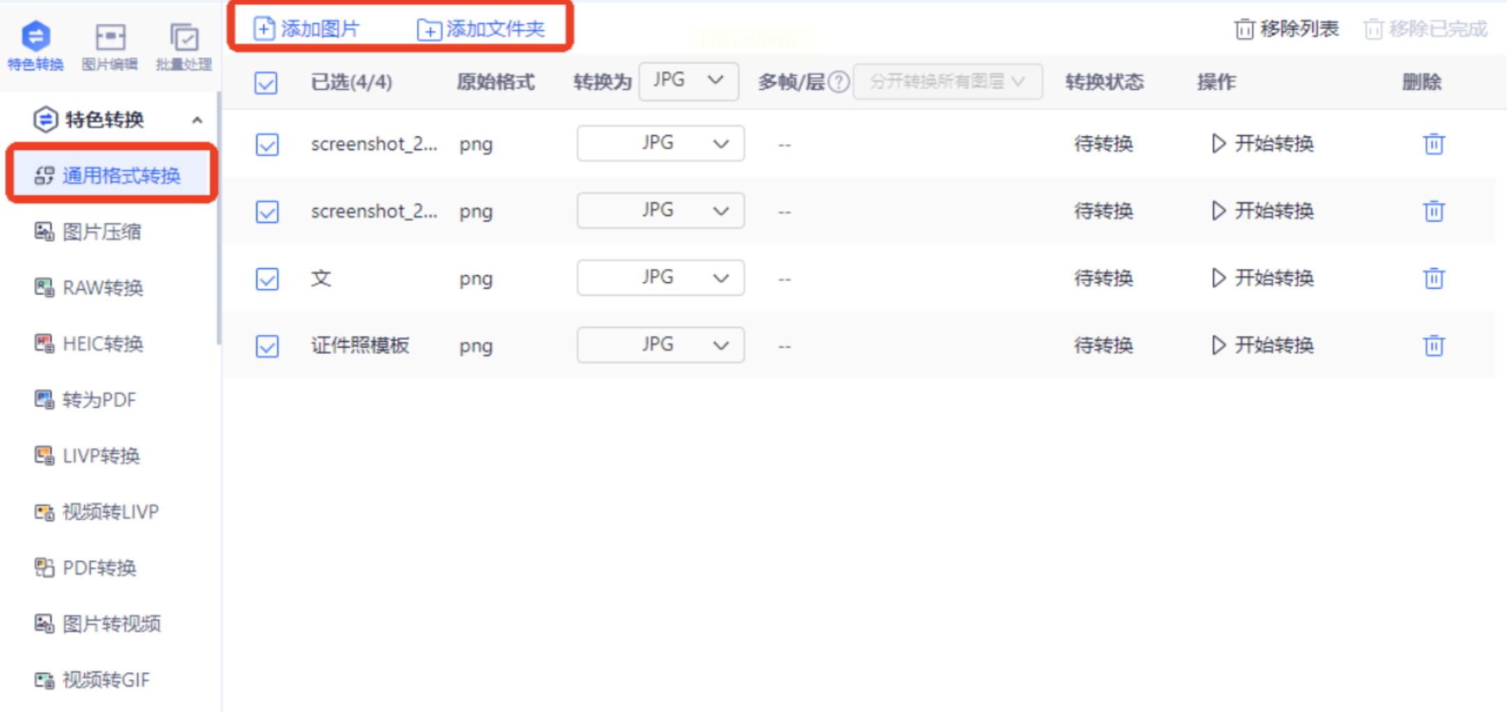 4. 点击“开始转换”,系统会自动处理每张图片,转换过程在后台完成