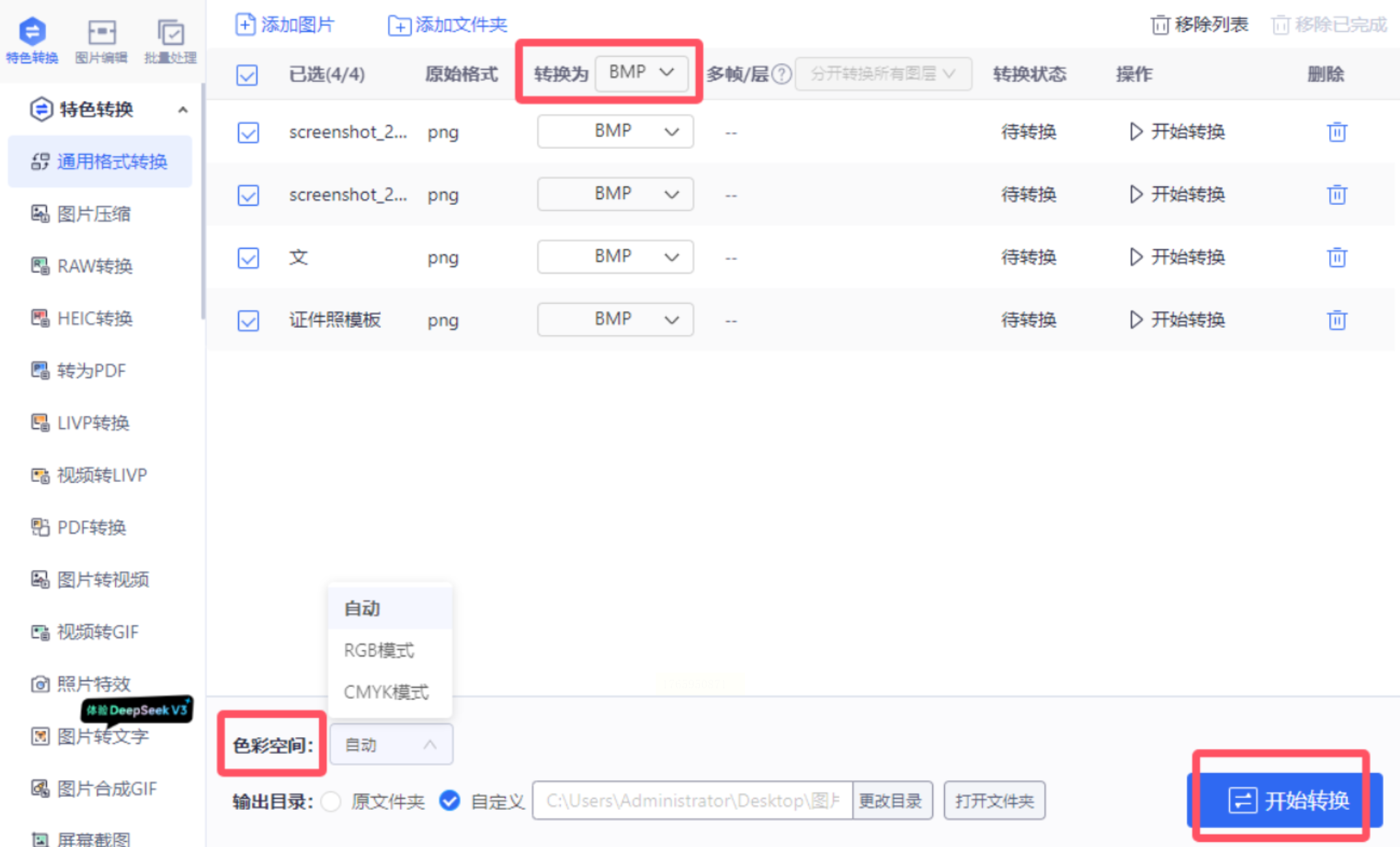 3. 选择“PNG转BMP”转换类型,系统会自动识别图片格式
