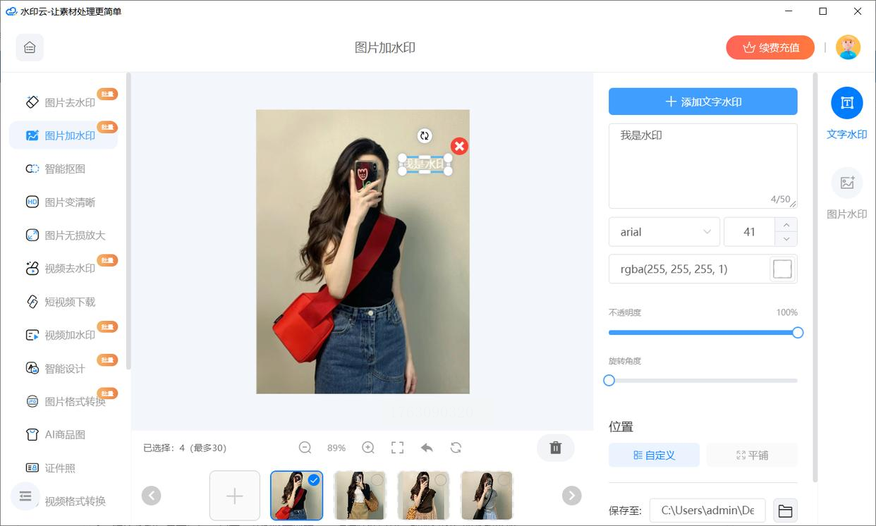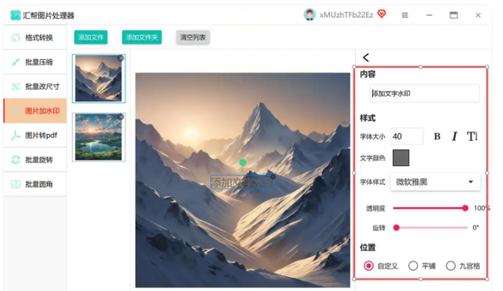 3. 在设置水印时,无论是文字还是图片水印,你都可以进行细致的调整。完成一张图片的水印设置后,留意一个非常实用的按钮——“应用到全部”。点击它,你当前的所有设置(包括位置、大小、透明度)就会瞬间应用到所有已导入的图片上,免去了你重复劳动的麻烦。
