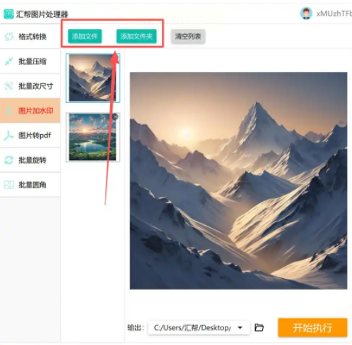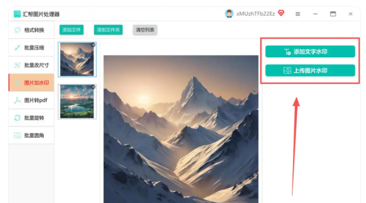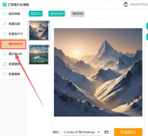 在你的电脑上找到“汇帮图片处理器”的图标,双击打开它。软件启动后,你会看到一个清爽的界面,左侧通常有一排功能列表。在这里,请你找到并点击“图片加水印”这个选项。这一步是告诉软件:“我接下来要进行的工作是给图片添加水印。”