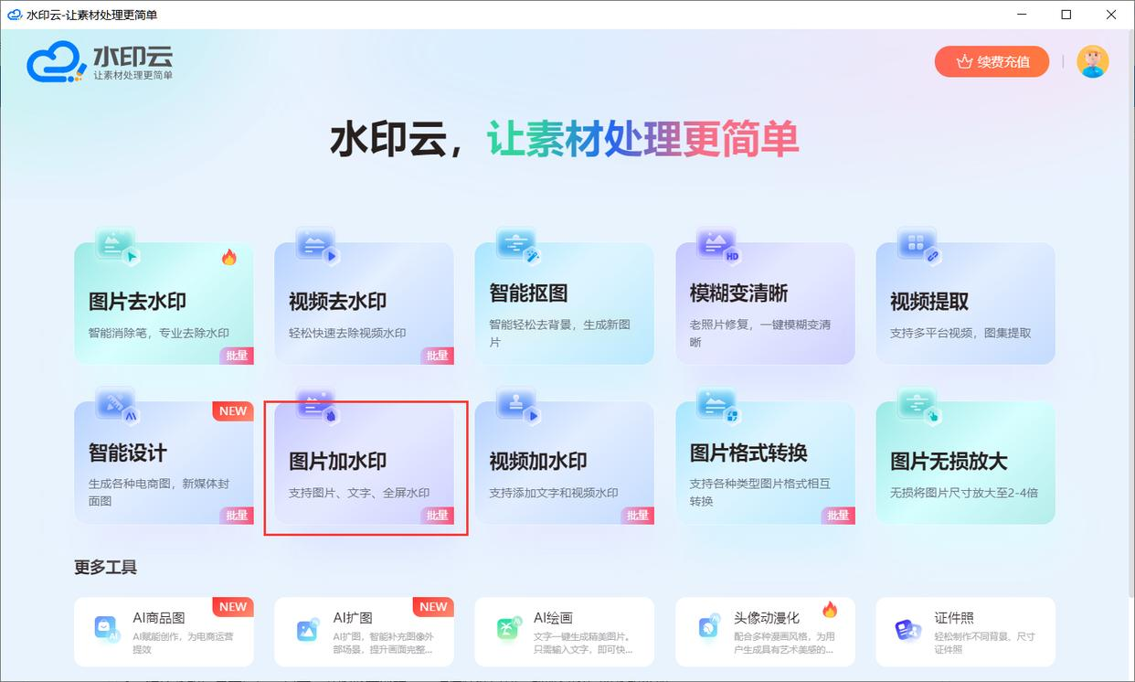 1. 打开“水印云”软件,在主界面上,你的目光会立刻被“图片加水印”这个核心功能所吸引,点击进入。