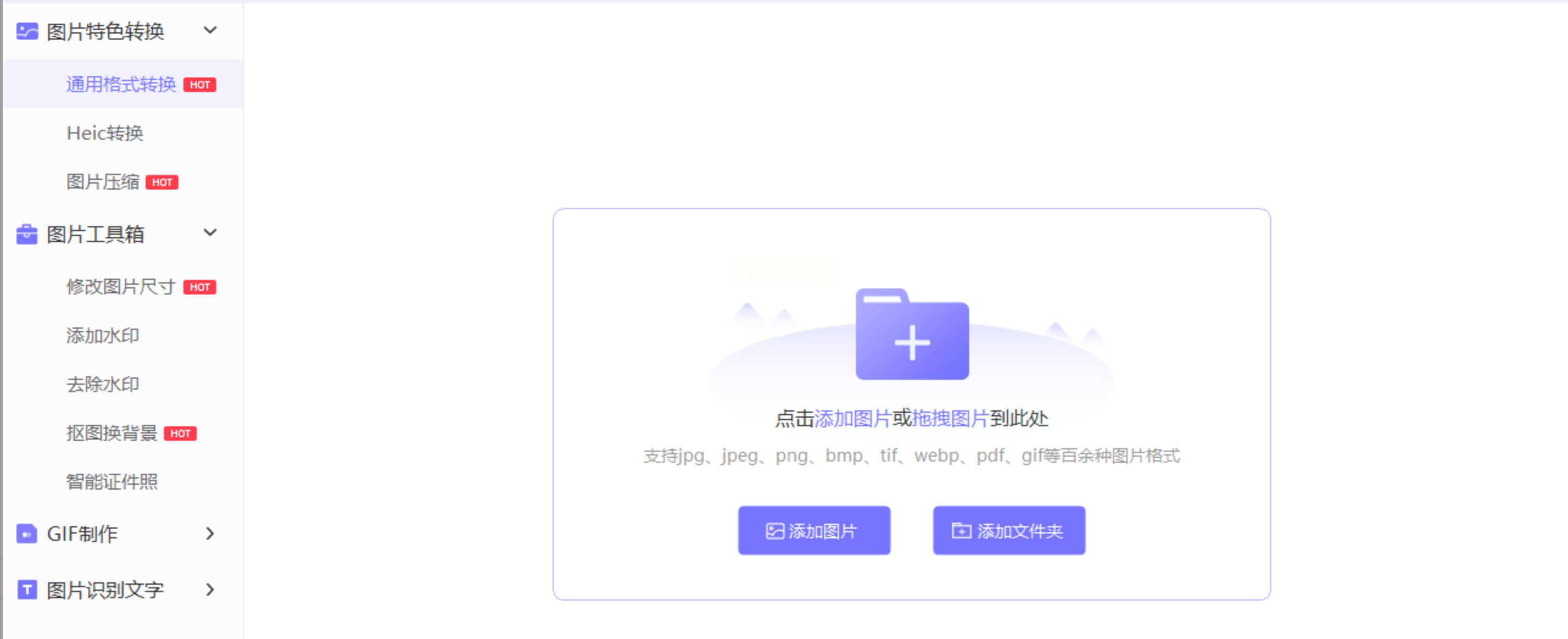打开汇帮图片处理器后,主界面左侧提供"添加文件"和"拖入文件"两种导入方式。支持单次导入多张TIF文件,也可通过"添加文件夹"批量导入整个文件夹中的图像。软件支持的格式包括常见的JPG、PNG、GIF、BMP等,确保不同来源的图片都能兼容。